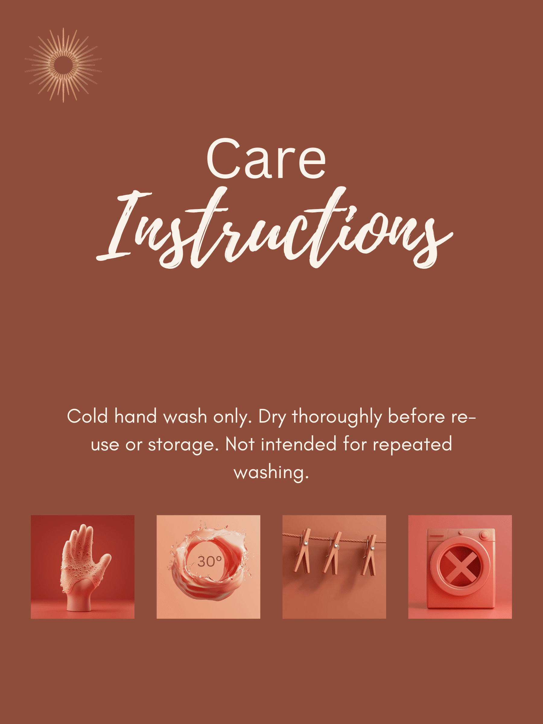 Cold hand wash only. Dry thoroughly before re-use or storage. Not intended for repeated washing.