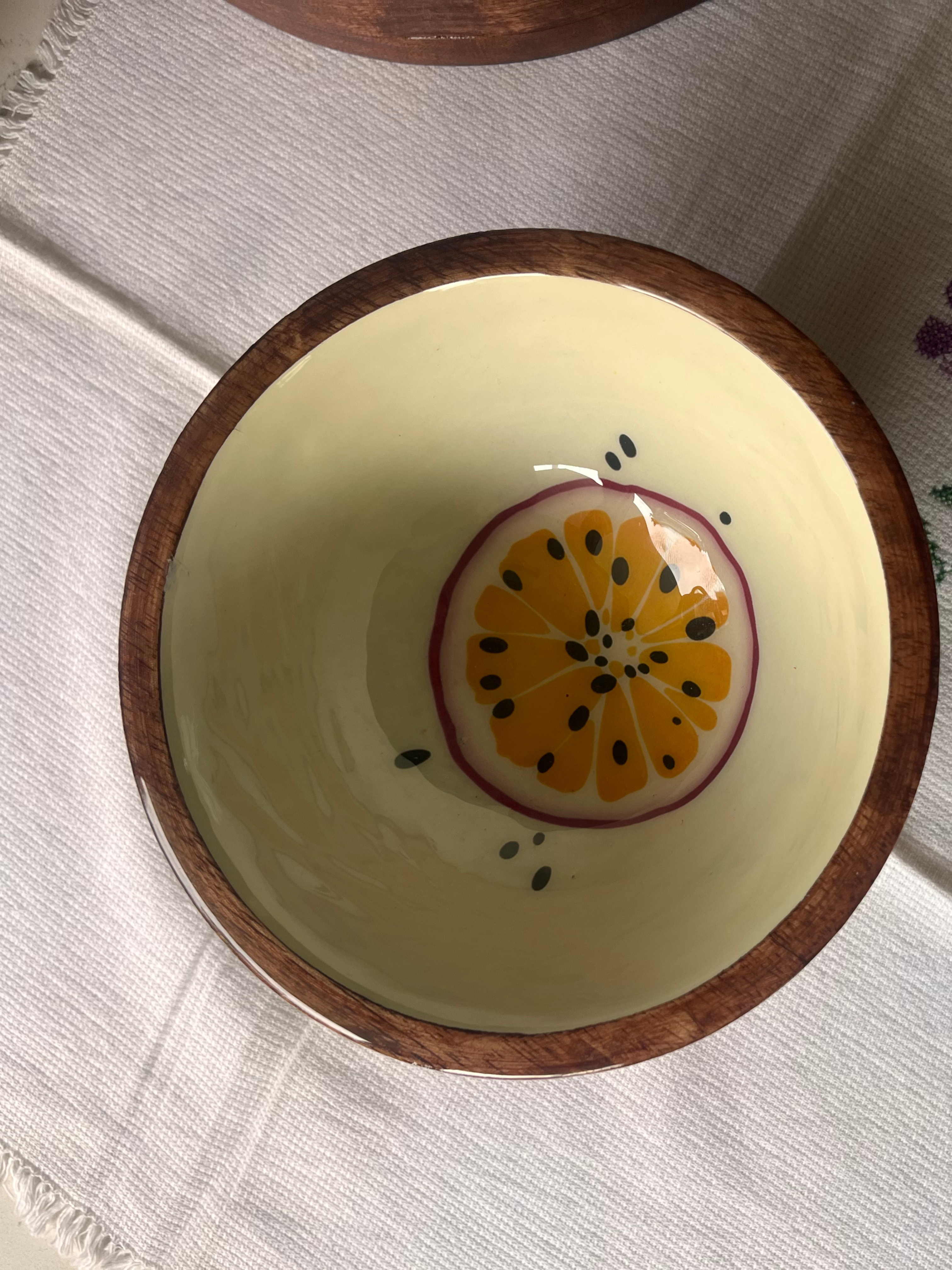 A set of two stylish wooden snack bowls featuring a vibrant passion fruit print. Ideal for nuts, dips, candies or small servings, making them a perfect mix of utility and charm.