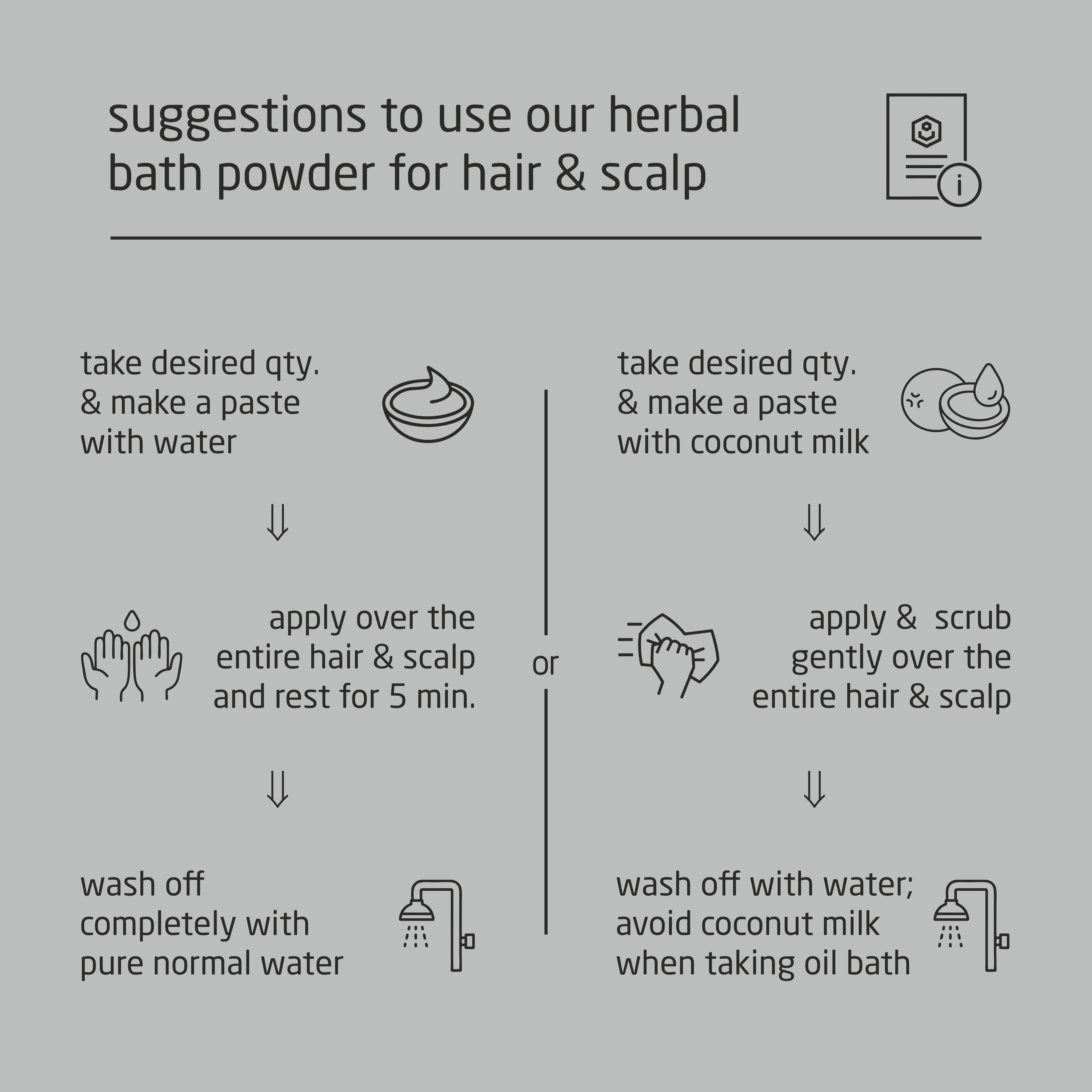 Suggested Usage Make a paste by diluting the powder with water and apply completely over the hair and scalp. Take water in a cup and pour a little with hands over the area of the head which is to be scrubbed. Gently scrub until the area is cleansed. If needed, water can be added while scrubbing but ensure that the level of water is neither more or less. If more water is added during scrubbing, it might wash off the powder. Repeat this for the entire head and wash off twice with pure water. Using fresh coconut milk to form a paste for regular usage enhances the bathing experience. When taking oil bath, form a paste with water and do not use coconut milk. To effectively cleanse oil, apply the paste twice and bath if required