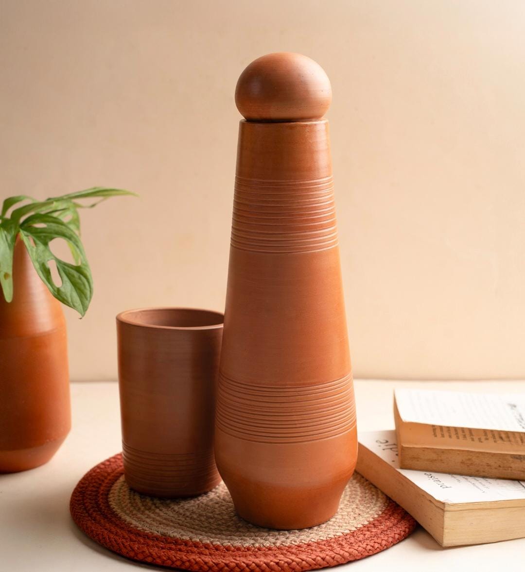 Stay hydrated with this handcrafted terracotta bottle (10") and tumbler (5.5"), designed to naturally cool water while enhancing its taste. Made from 100% natural clay, this eco-friendly set offers a sustainable and healthier alternative to plastic or metal bottles. The earthy finish and simple elegance make it a perfect addition to your home, office, or wellness space.