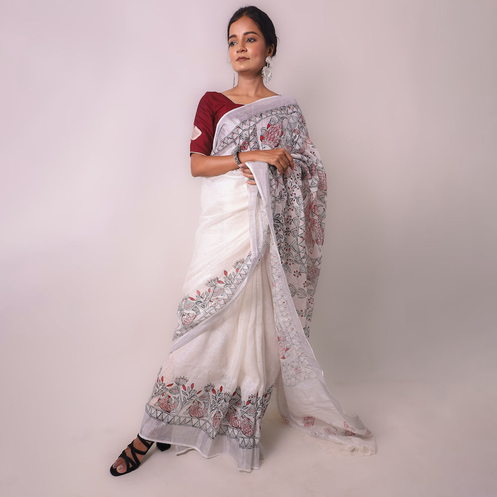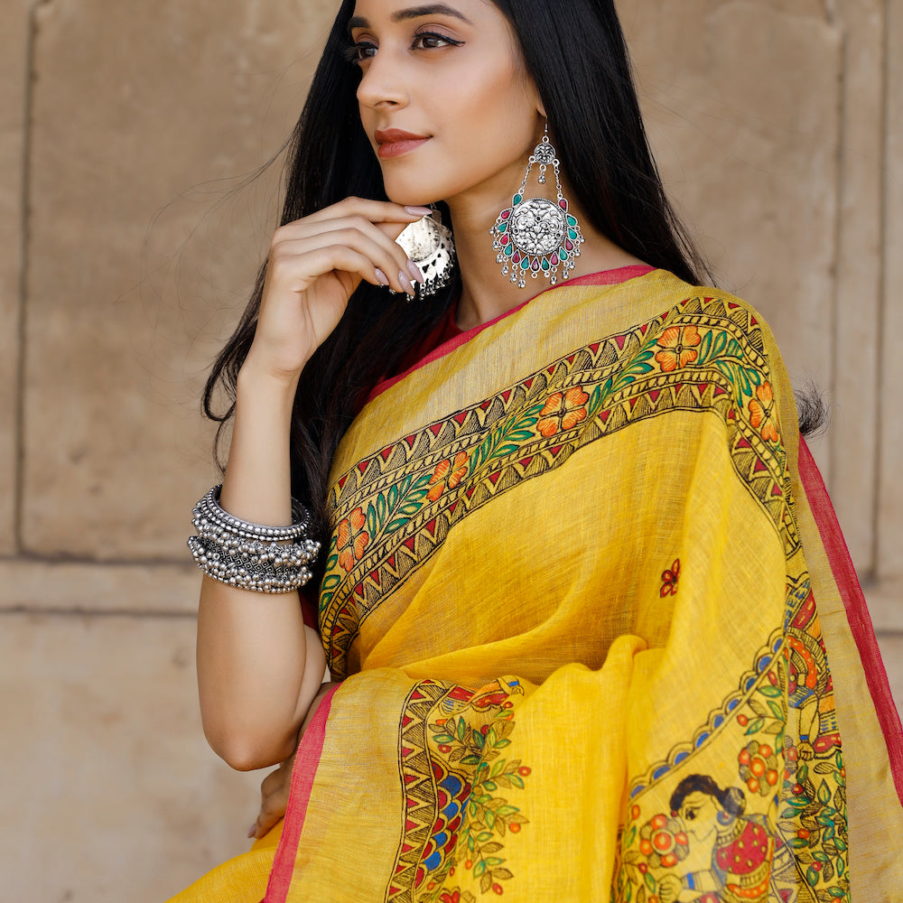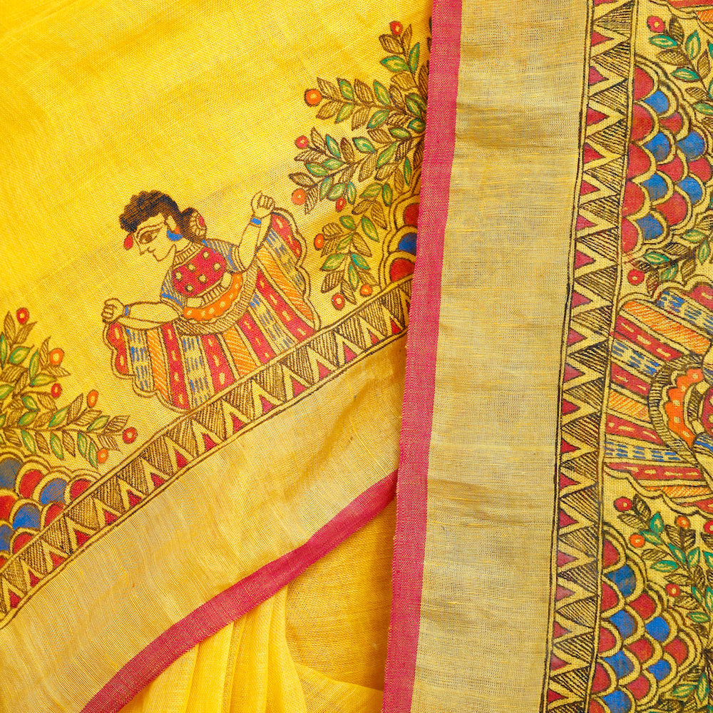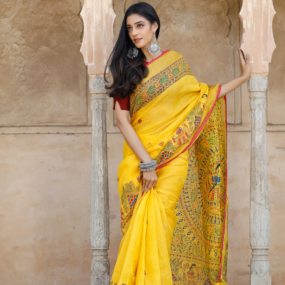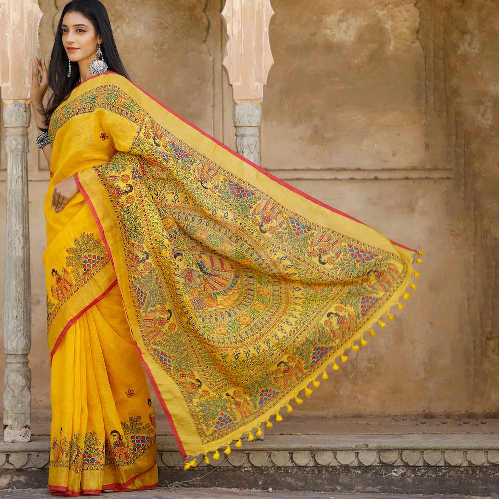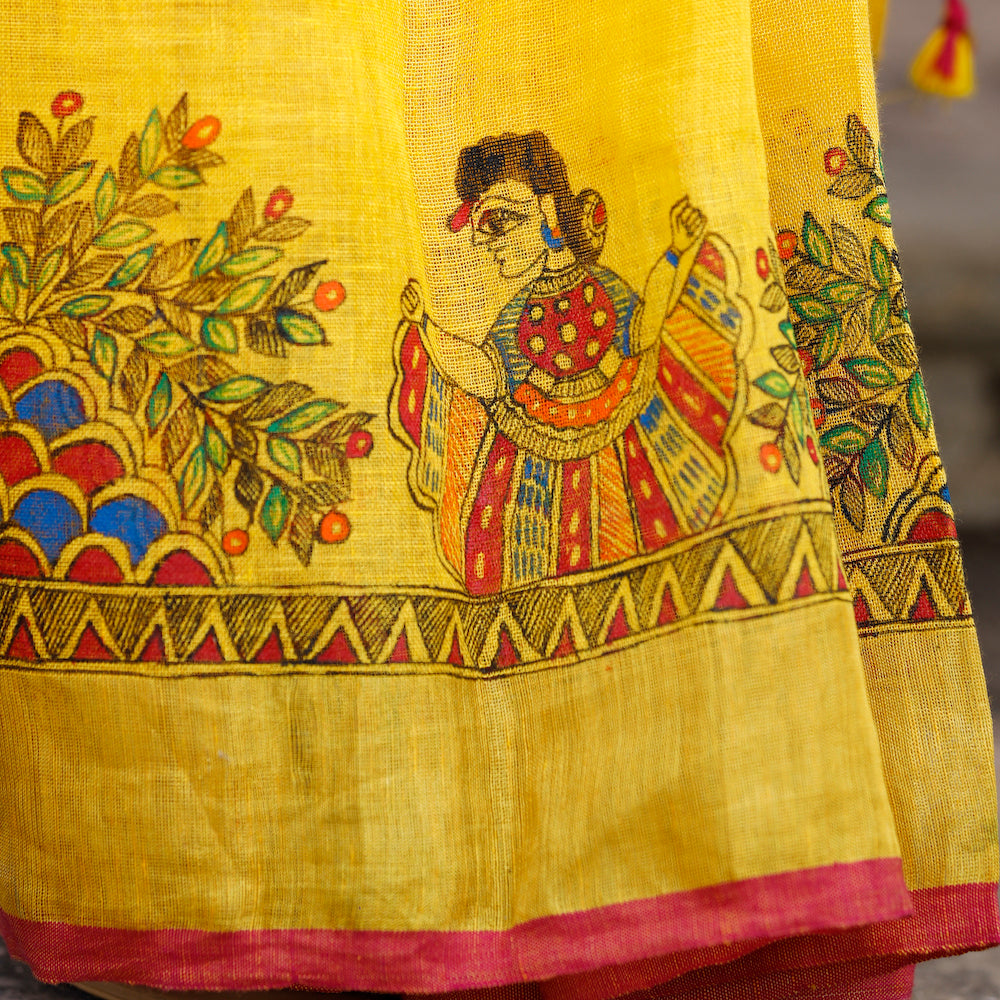 Madhubani "Radha Sang Krishna Holi " Hand-Painted Linen Saree
