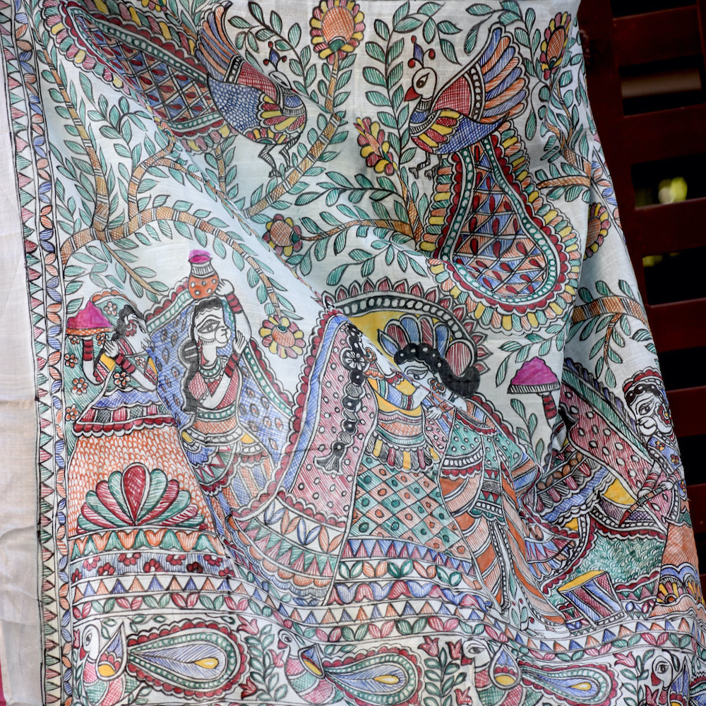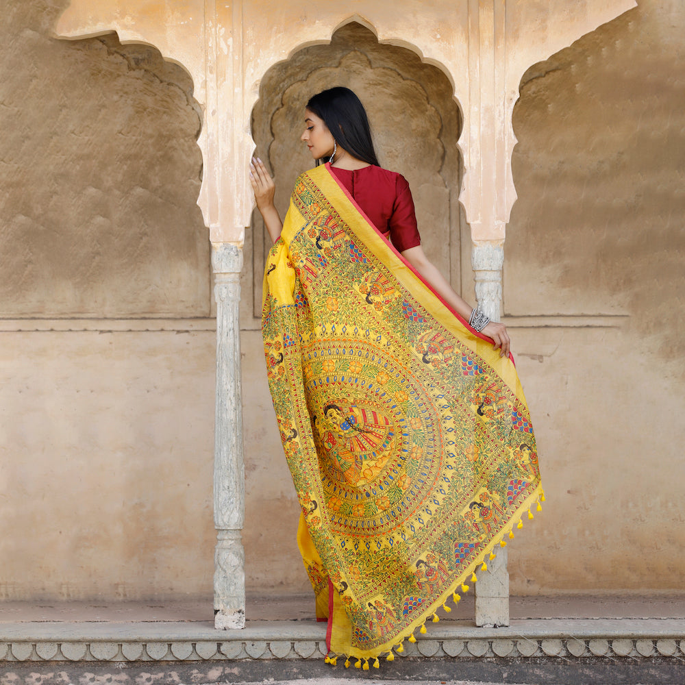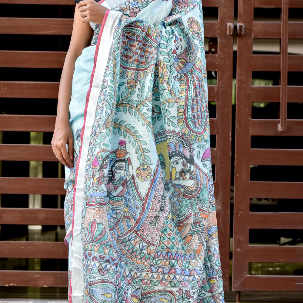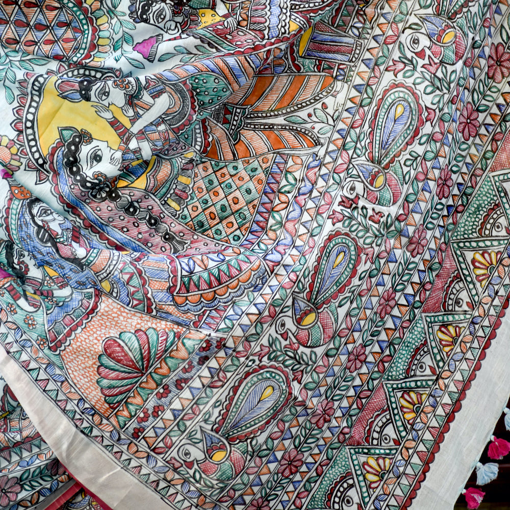 Madhubani Hand-Painted Radha Krishna Tussar Silk Saree