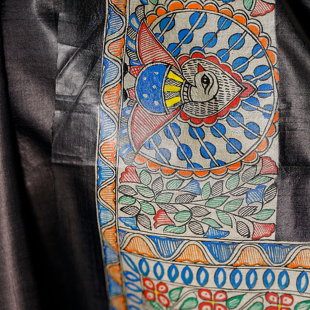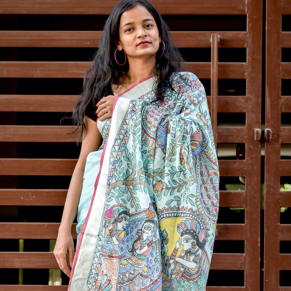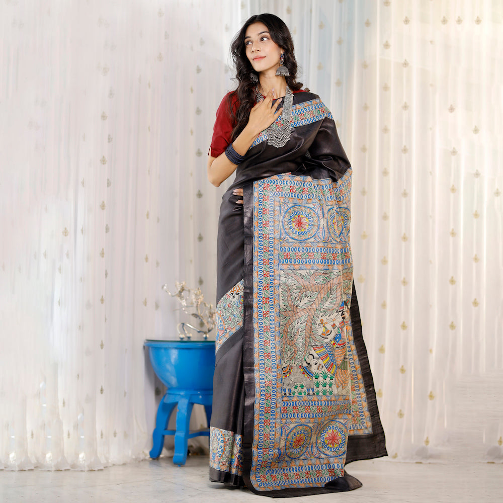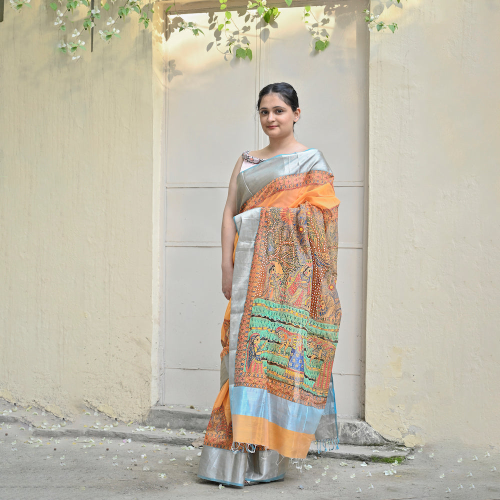 Madhubani Hand-Painted Radha Krishna Tussar Silk Saree
