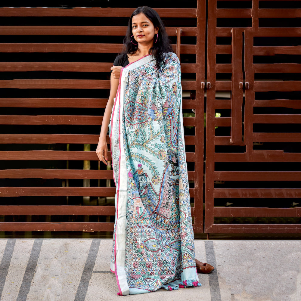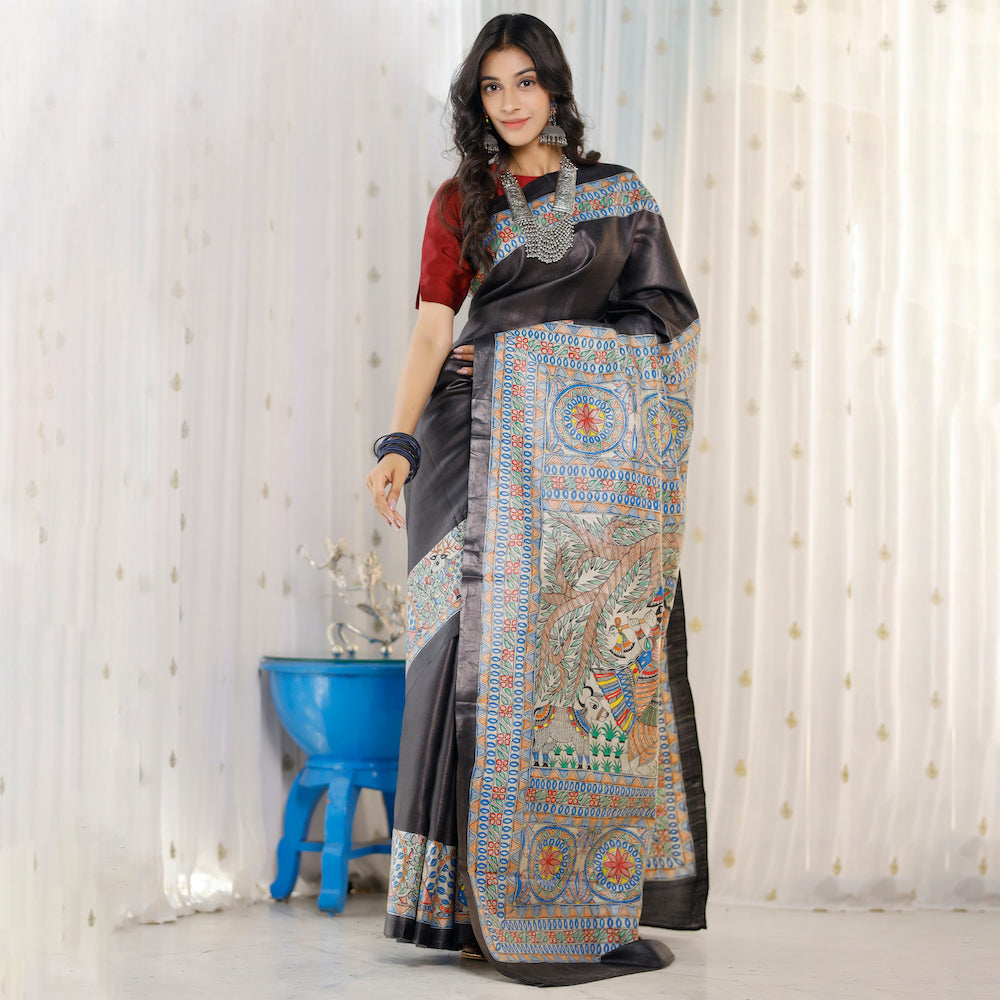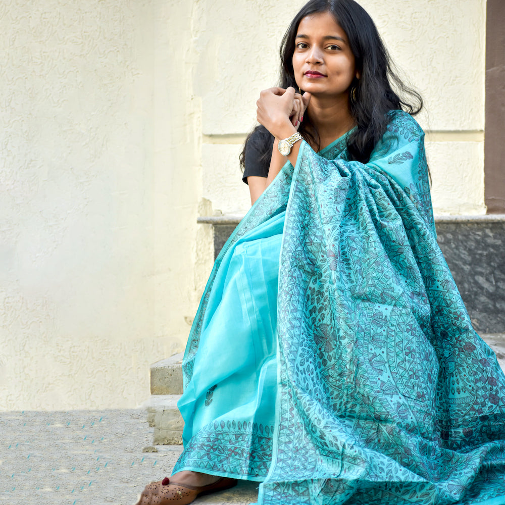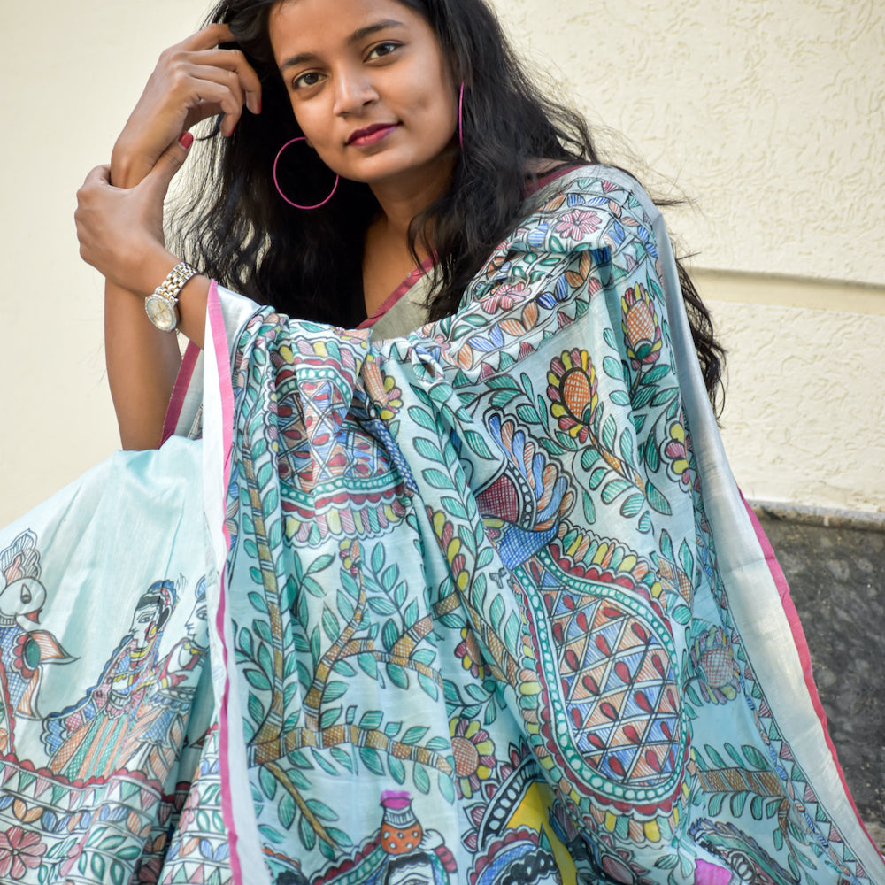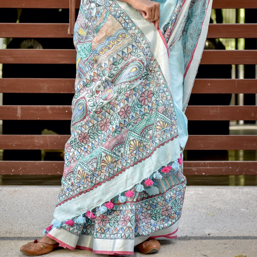 Madhubani Blue Tussar Silk Hand-Painted Saree