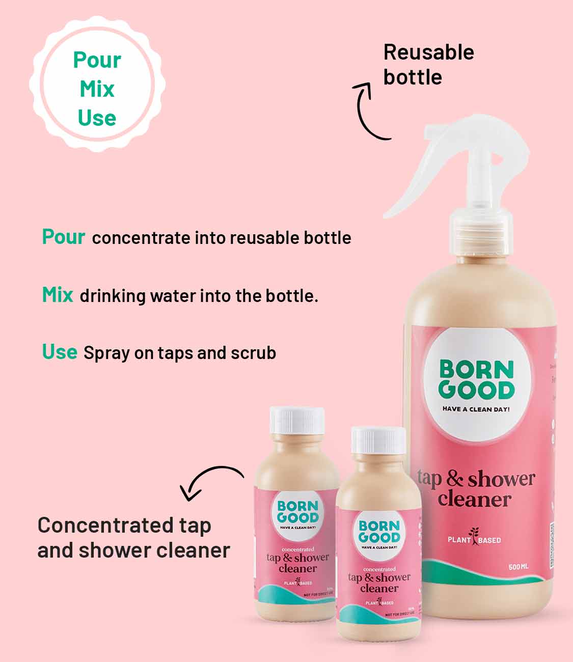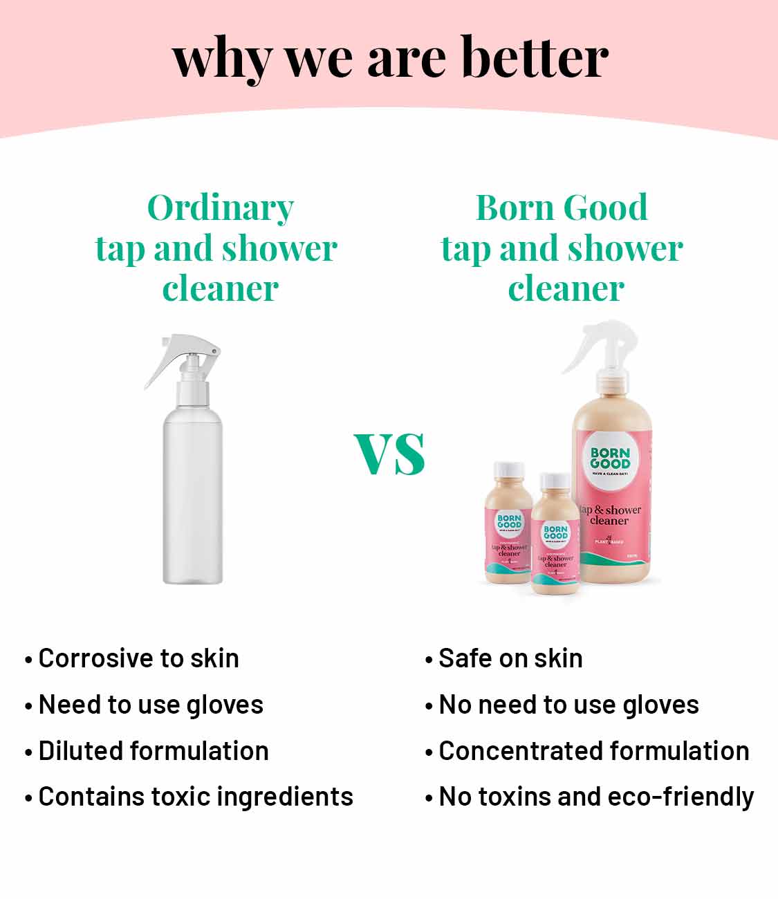 Unlike ordinary tap & shower cleaners that are made up of 80% water, our concentrated tap & shower cleaner is made using only 40% water. This makes it easy on your wallet as well. This product saves over 40% water as compared to traditional cleaners. As there is less transport of water, the carbon footprint is lower. It also saves space at home and reduces the frequency of shopping.