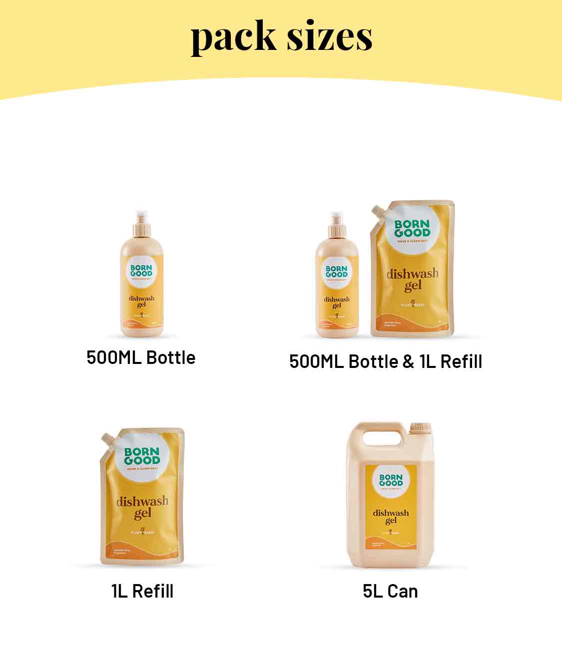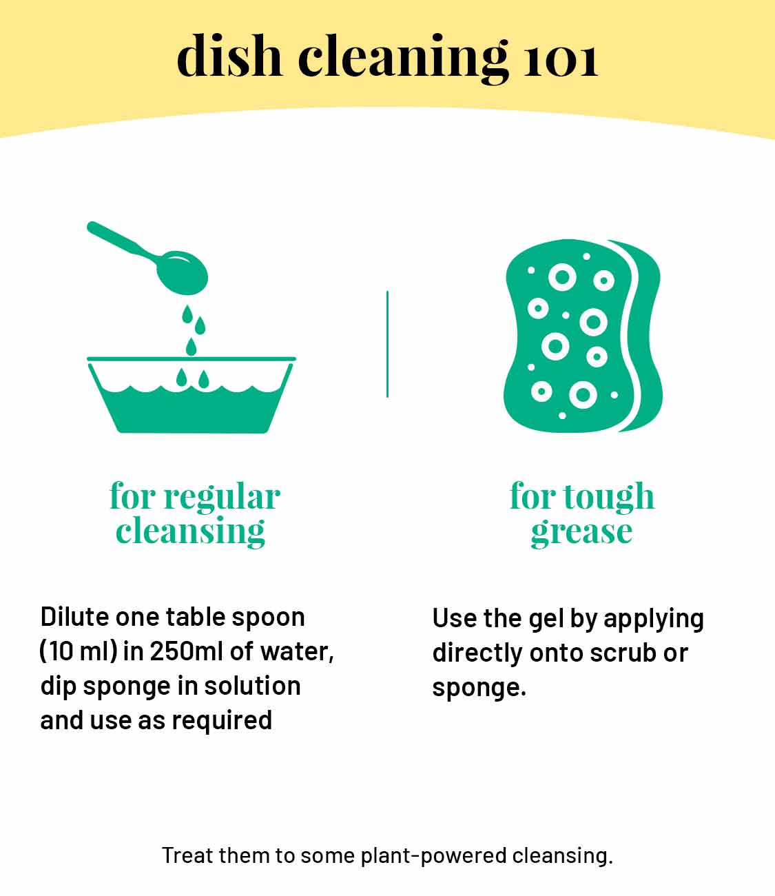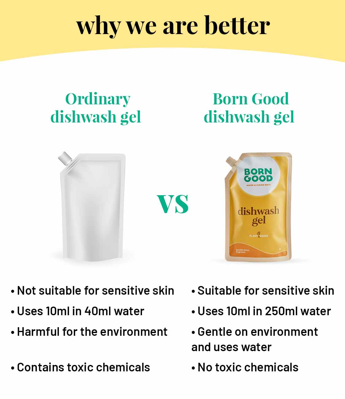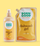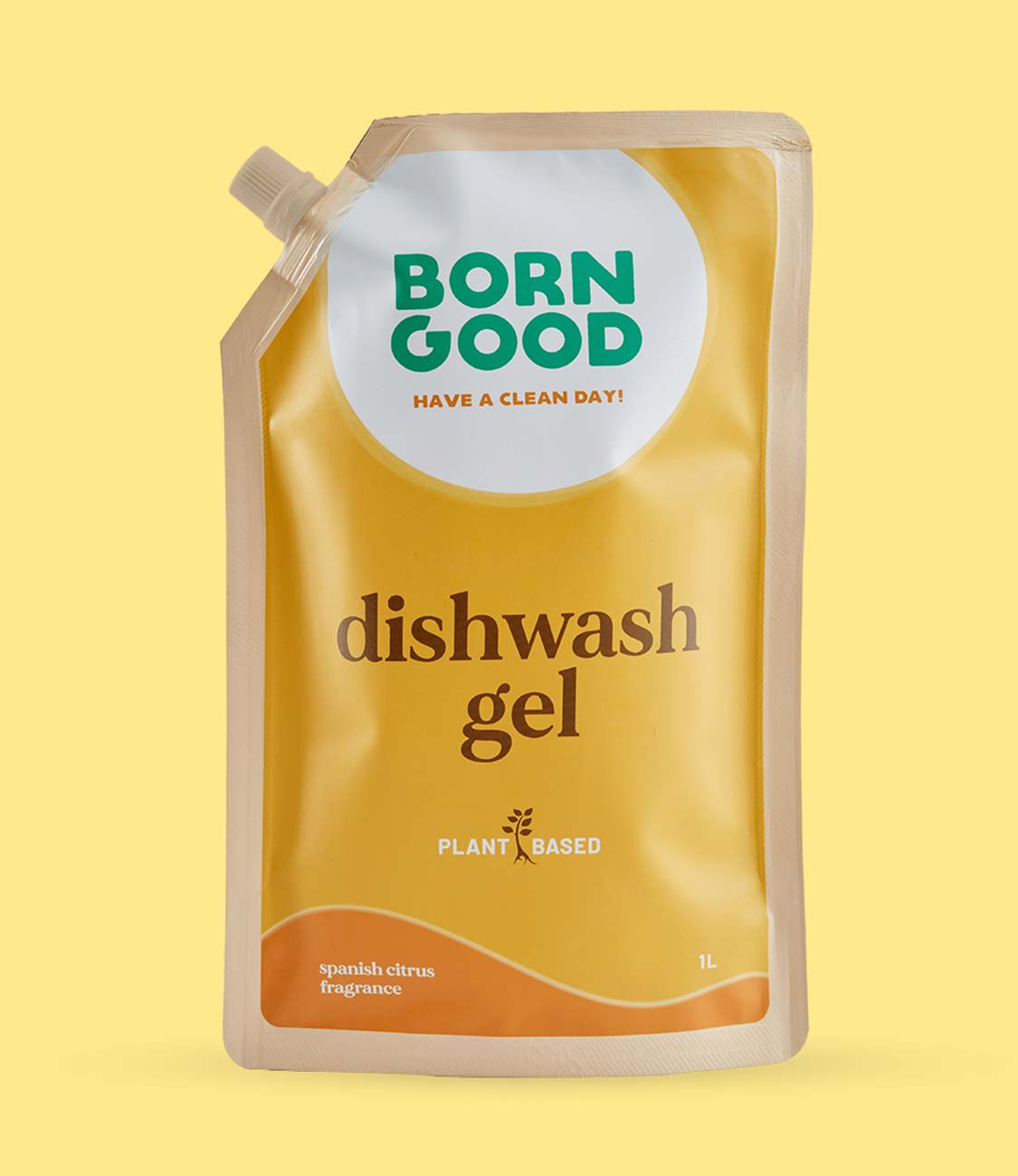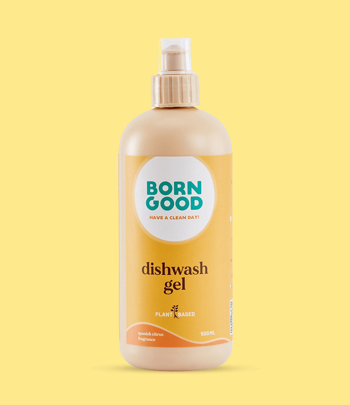 Born Good Dish Wash Gel deep cleans and degreases kitchenware and utensils effectively, while saving water due to its concentrated formula and leaving no malodors or sticky residues behind.