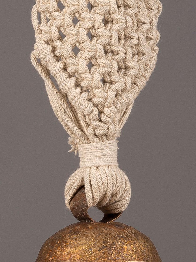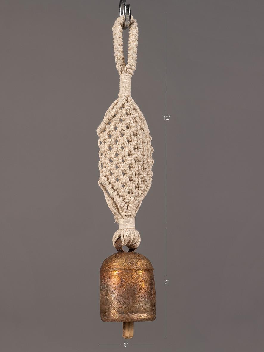 These bells are sourced from the desert lands of Nirona, near Kachchh (Gujarat) where they were initially used to identify cattle. Each bell is handcrafted from scrap iron sheets and coated with copper, and used as a modern decorative home accent with a beautifully hand-knotted wall hanging.