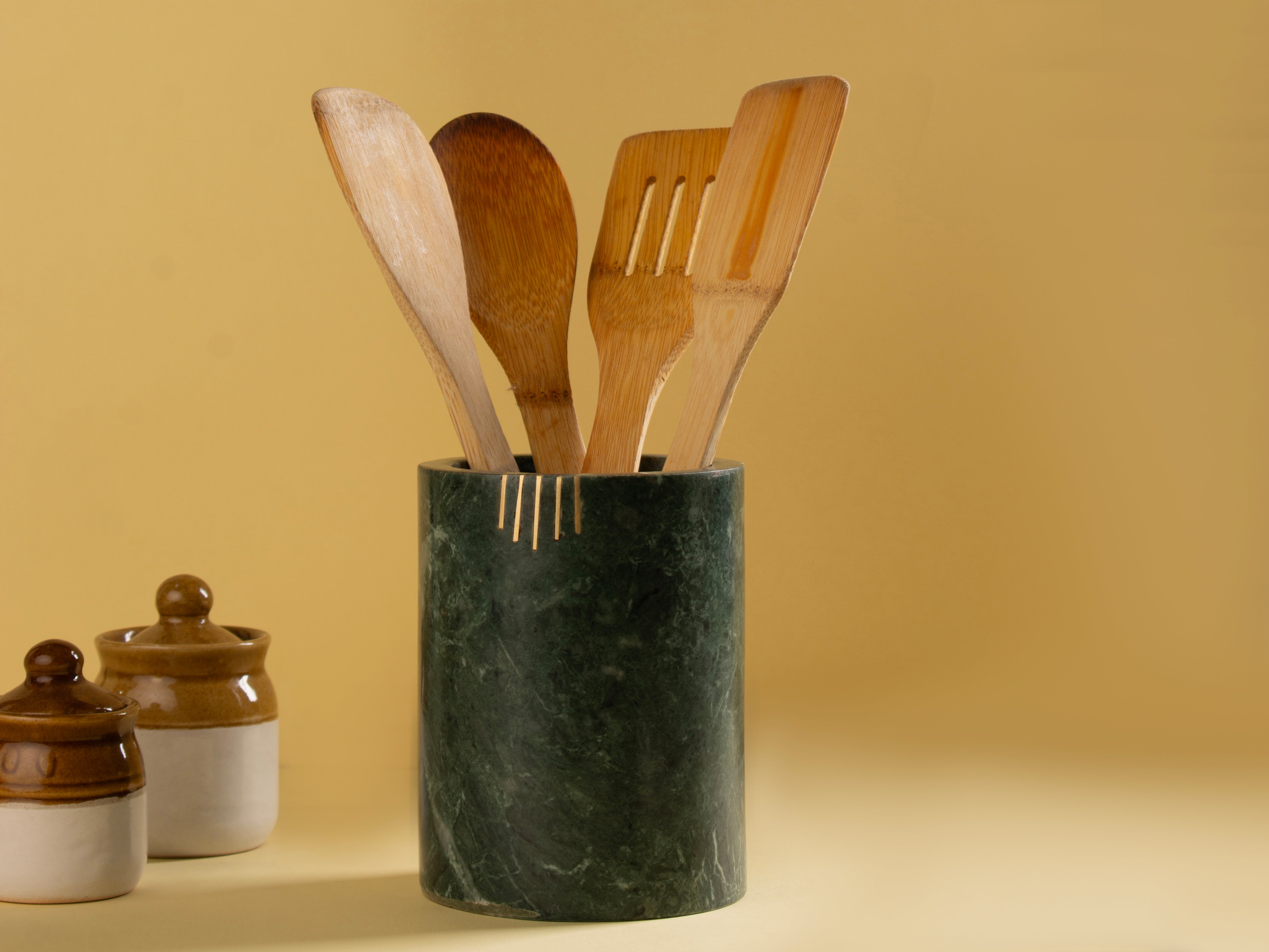 Organize your dining essentials in style with this luxurious green marble cutlery holder, accented with elegant brass inlay work. Handcrafted from natural marble, its rich, earthy tones and minimalistic design make it a timeless addition to your dining table or kitchen counter. Sturdy, sophisticated, and versatile — it’s perfect for holding cutlery, kitchen tools, or even as a stylish desk organizer.