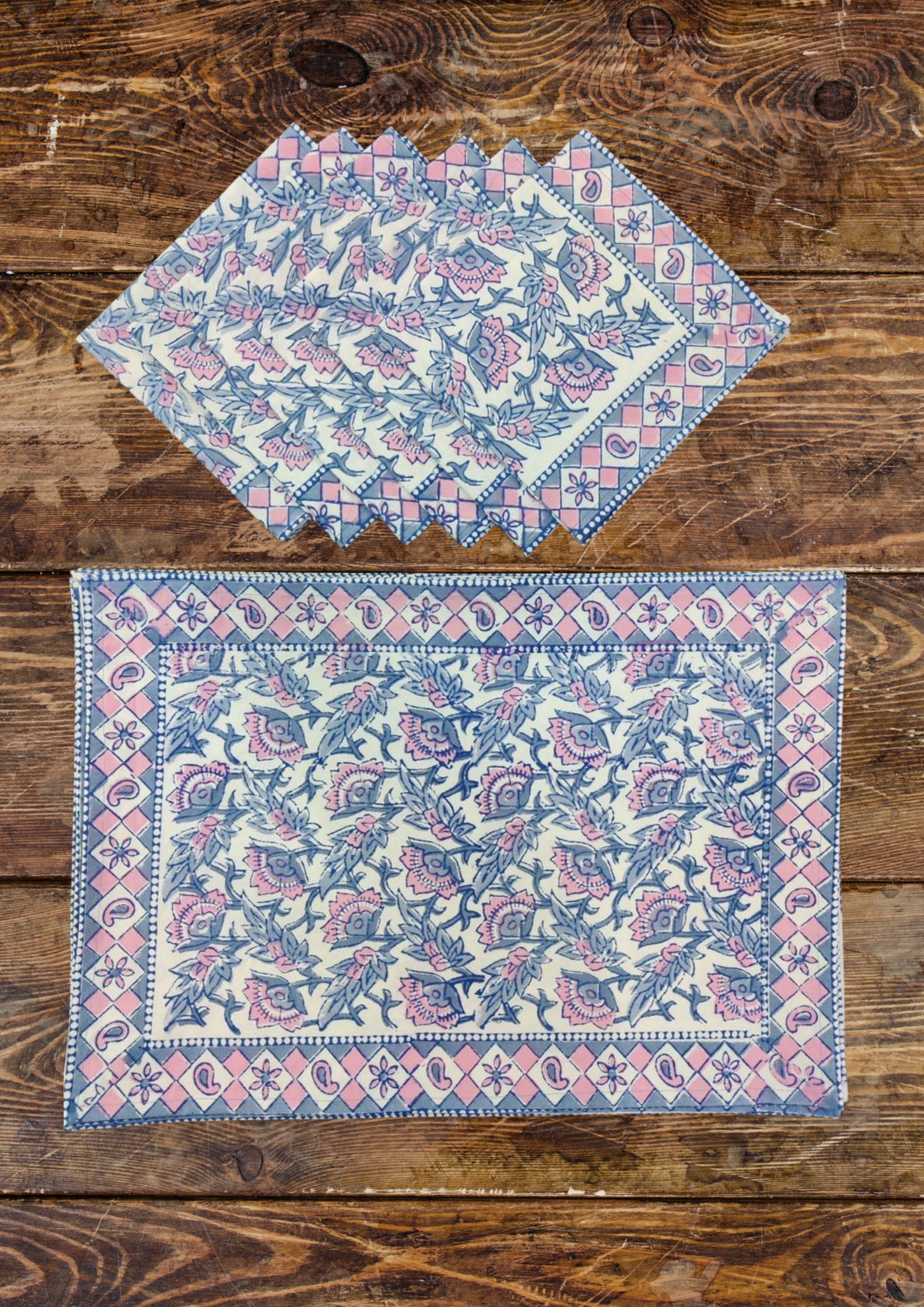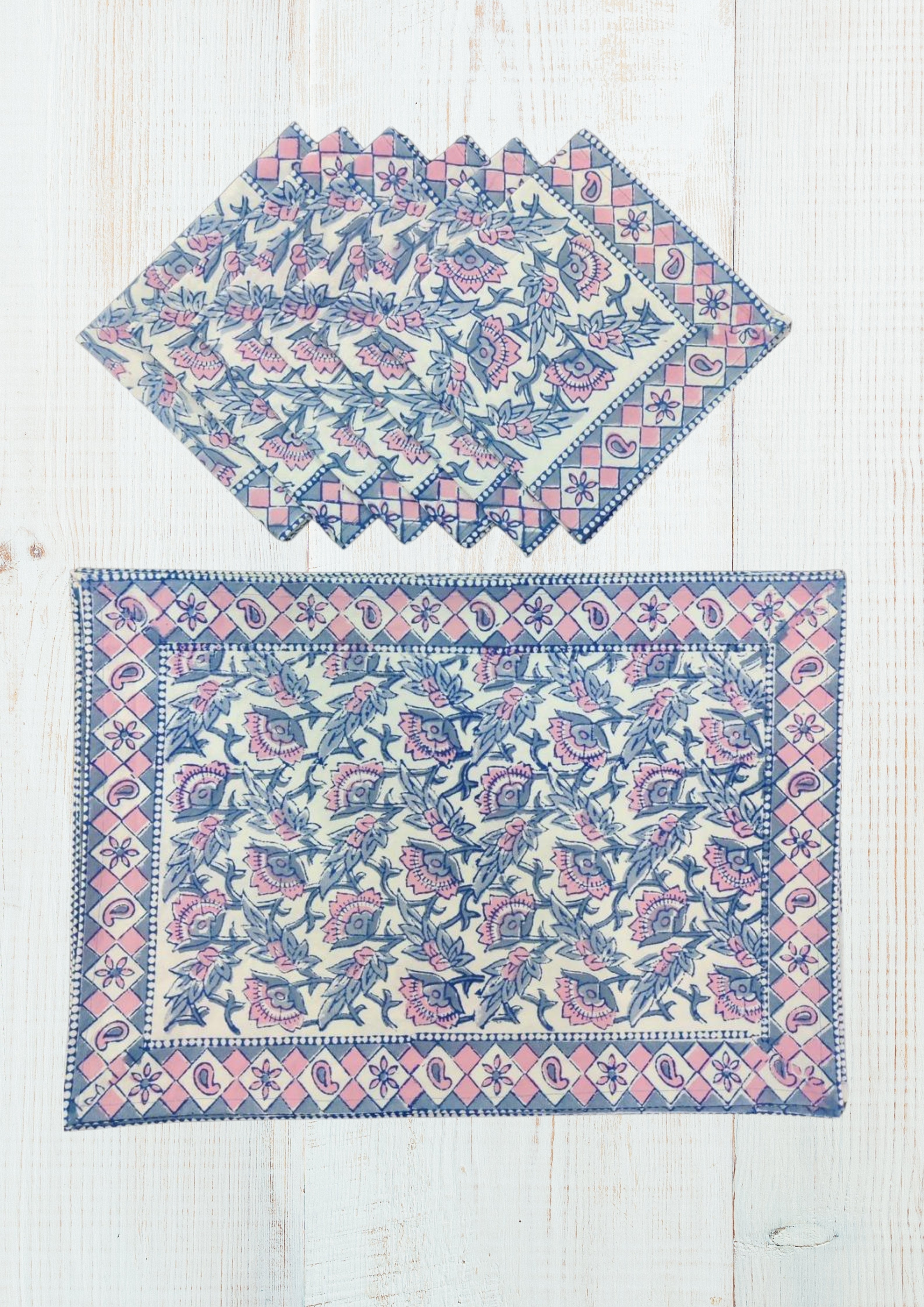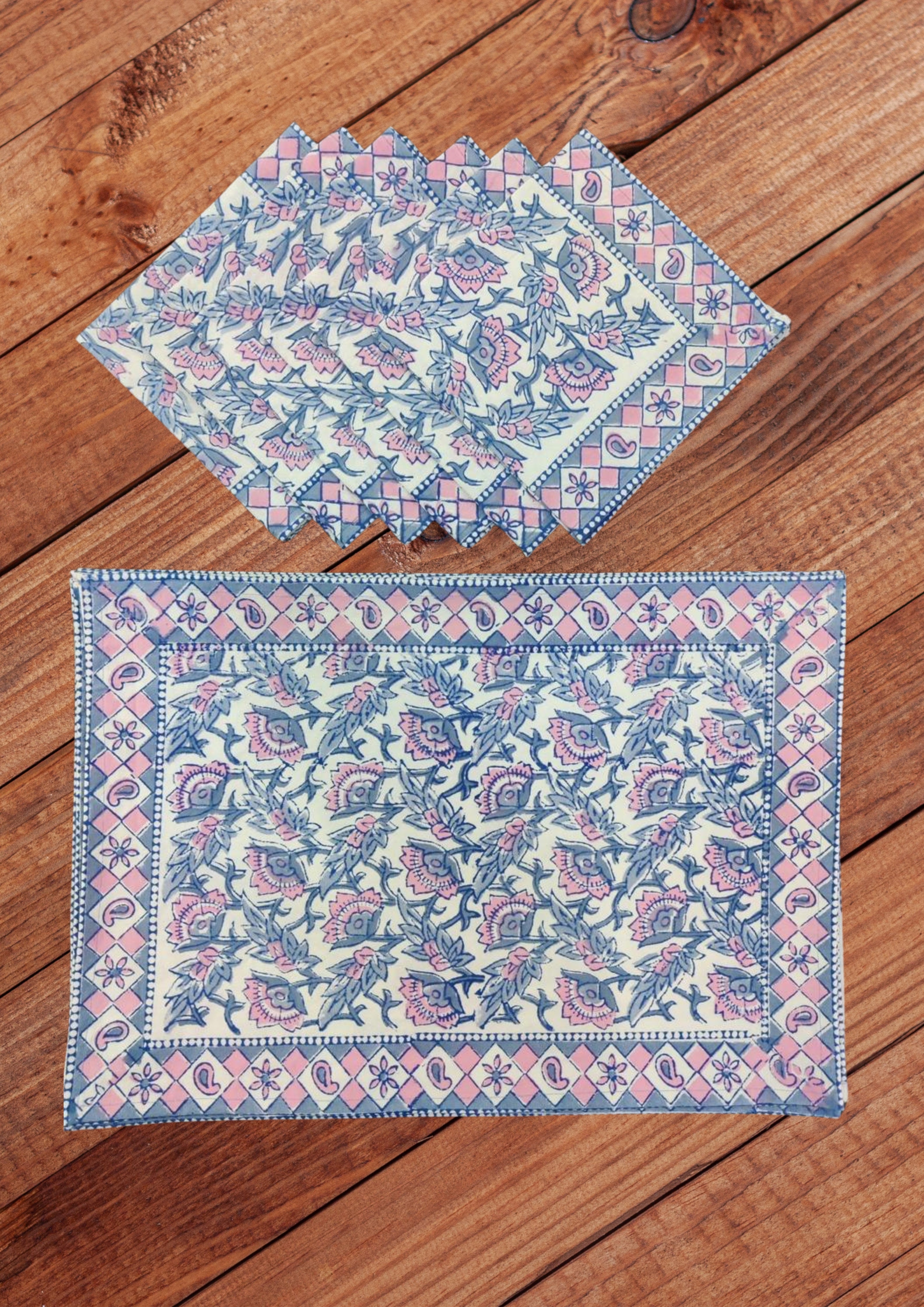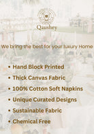 Handblock printed Canvas Table Mat and cotton Napkins. A beautiful collection of table mats and napkins handblock printed in Jaipur, Rajasthan distinguished by unique handblock printed motifs. These mats are perfect for any occasion from formal to casual adding to the appeal of the decor. Canvas Cotton Mats - 6 Nos, Soft Cotton Napkins - 6 Nos
