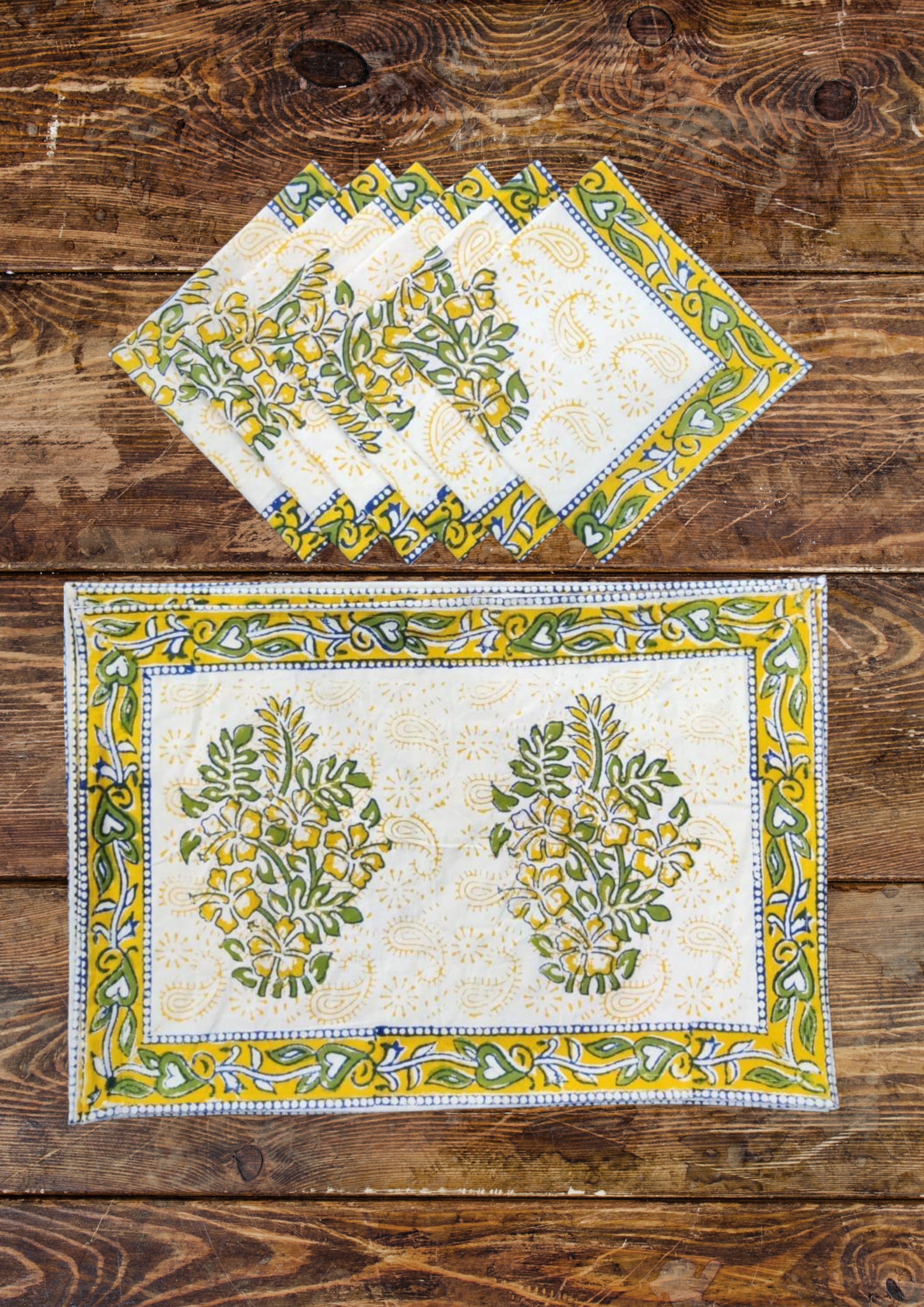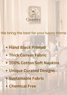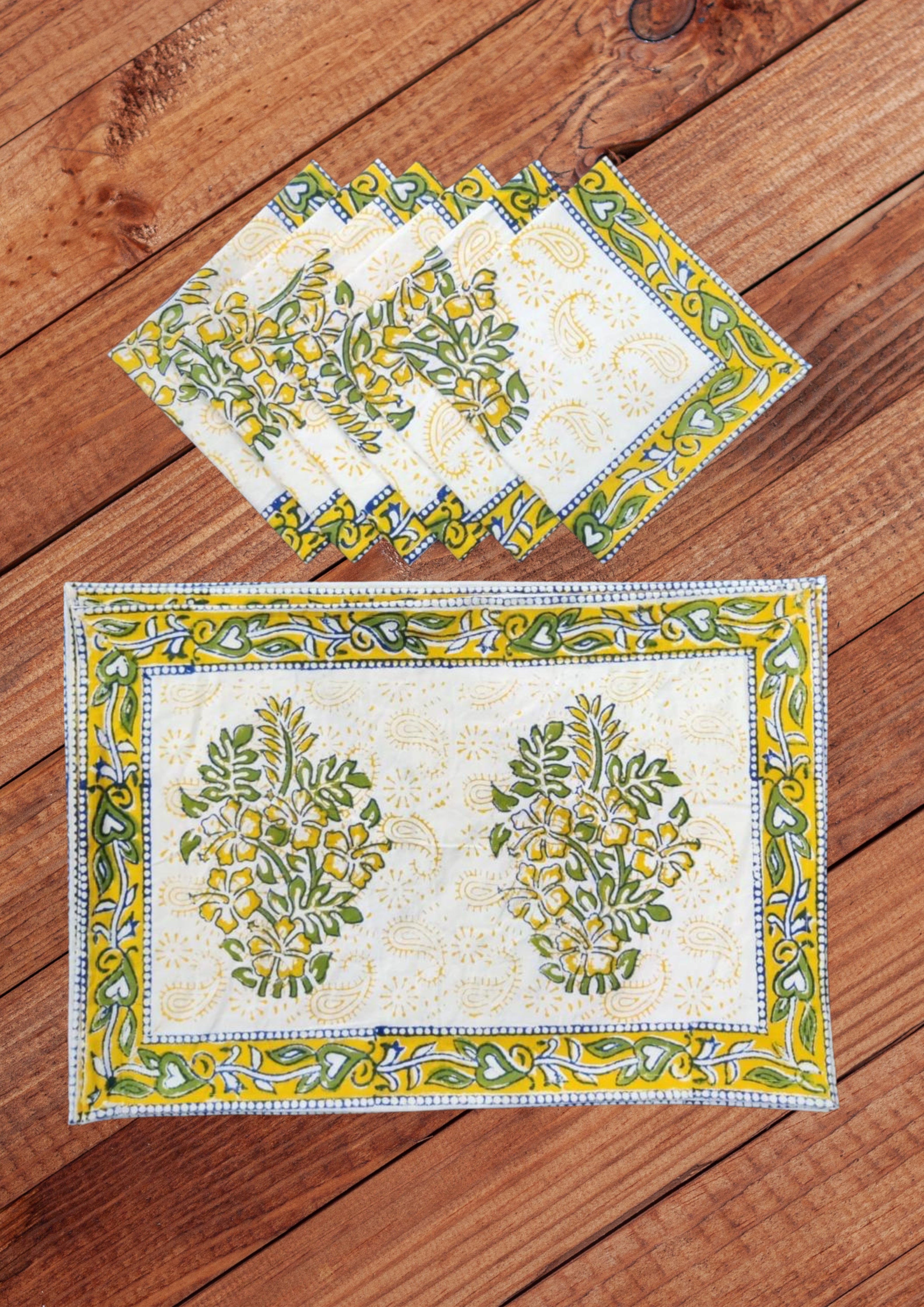 Handblock printed Canvas Table Mat and cotton Napkins. A beautiful collection of table mats and napkins handblock printed in Jaipur, Rajasthan distinguished by unique handblock printed motifs. These mats are perfect for any occasion from formal to casual adding to the appeal of the decor. Canvas Cotton Mats - 6 Nos, Soft Cotton Napkins - 6 Nos