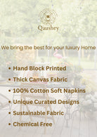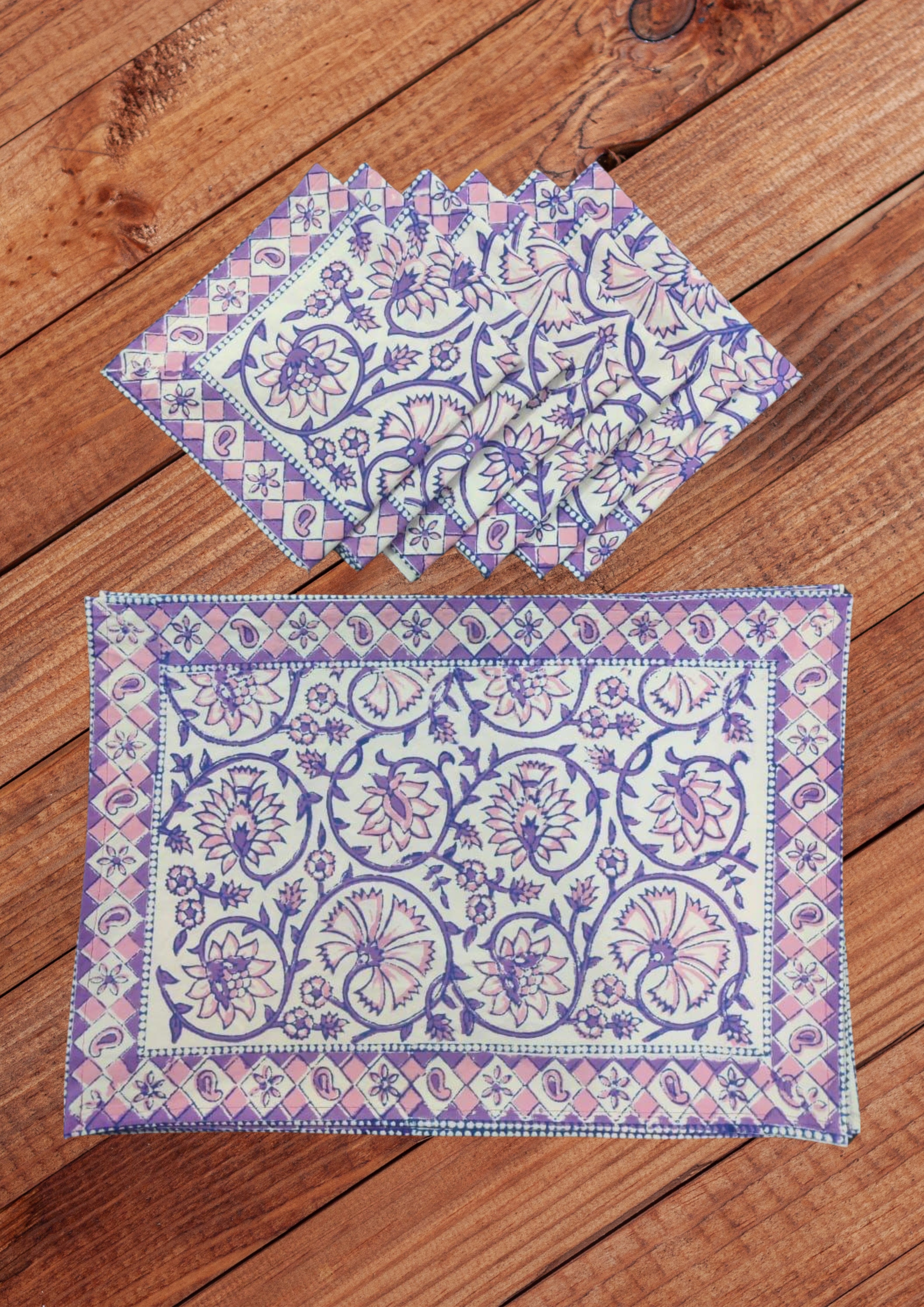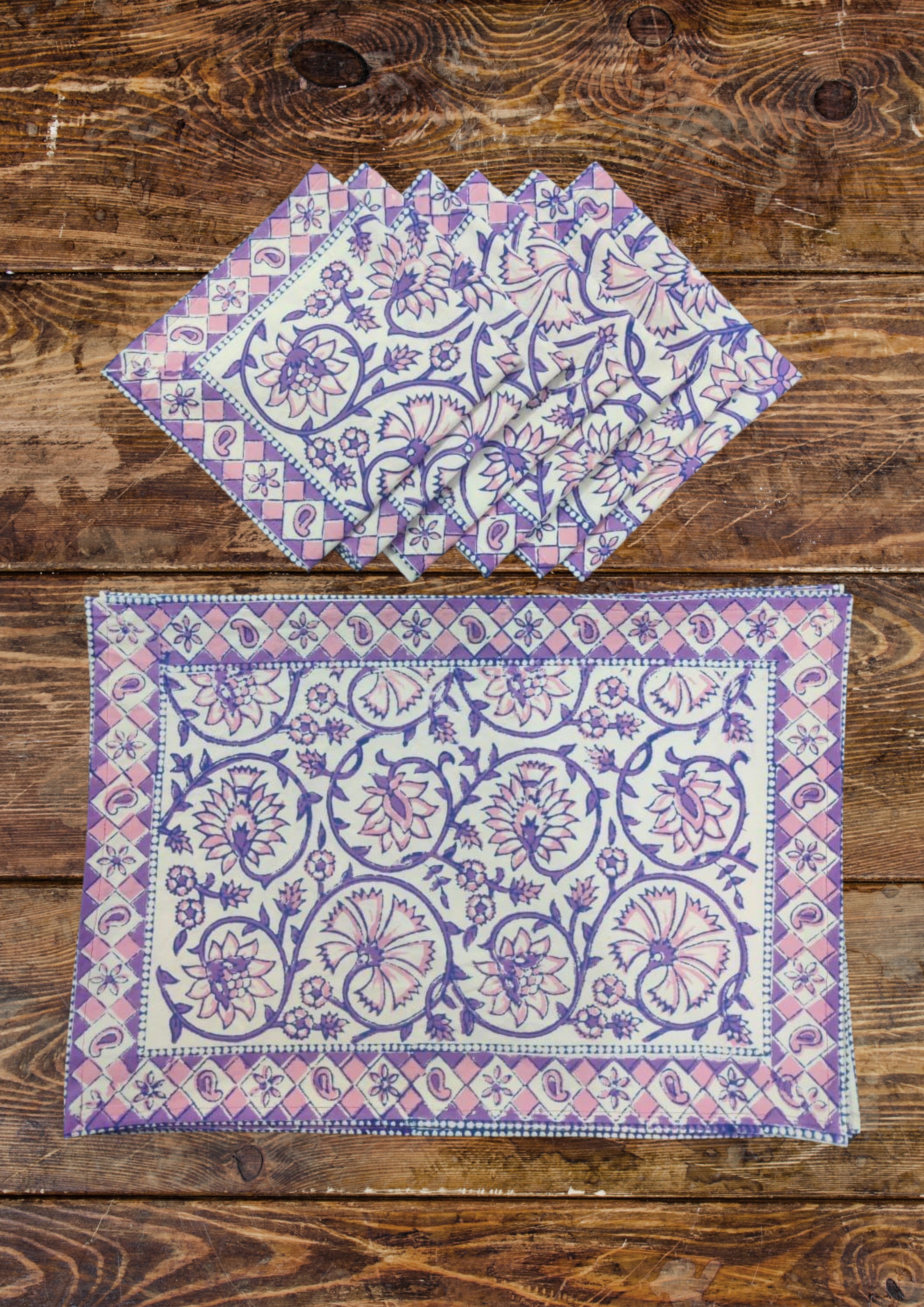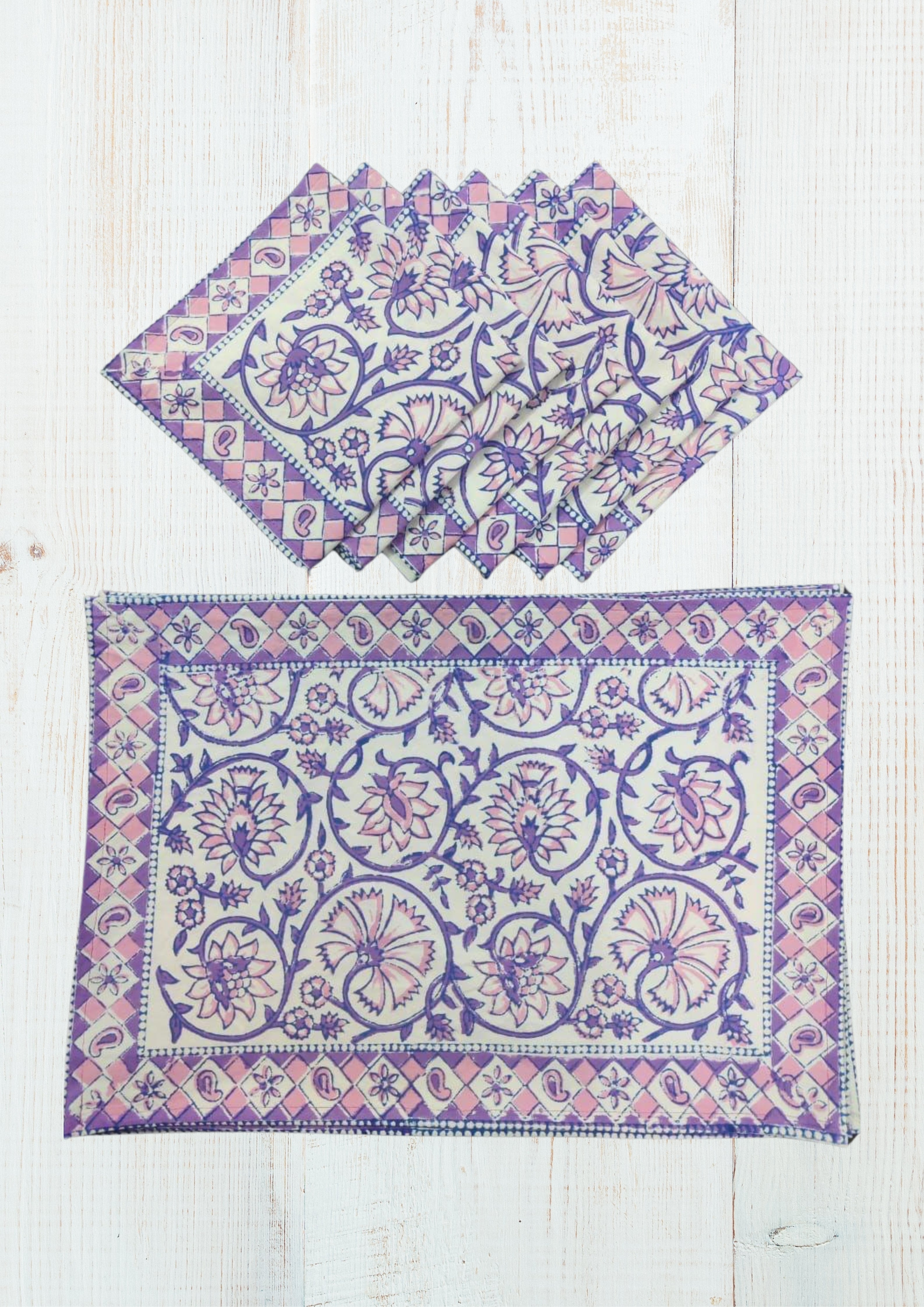 Handblock printed Canvas Table Mat and cotton Napkins. A beautiful collection of table mats and napkins handblock printed in Jaipur, Rajasthan distinguished by unique handblock printed motifs. These mats are perfect for any occasion from formal to casual adding to the appeal of the decor. Canvas Cotton Mats - 6 Nos, Soft Cotton Napkins - 6 Nos