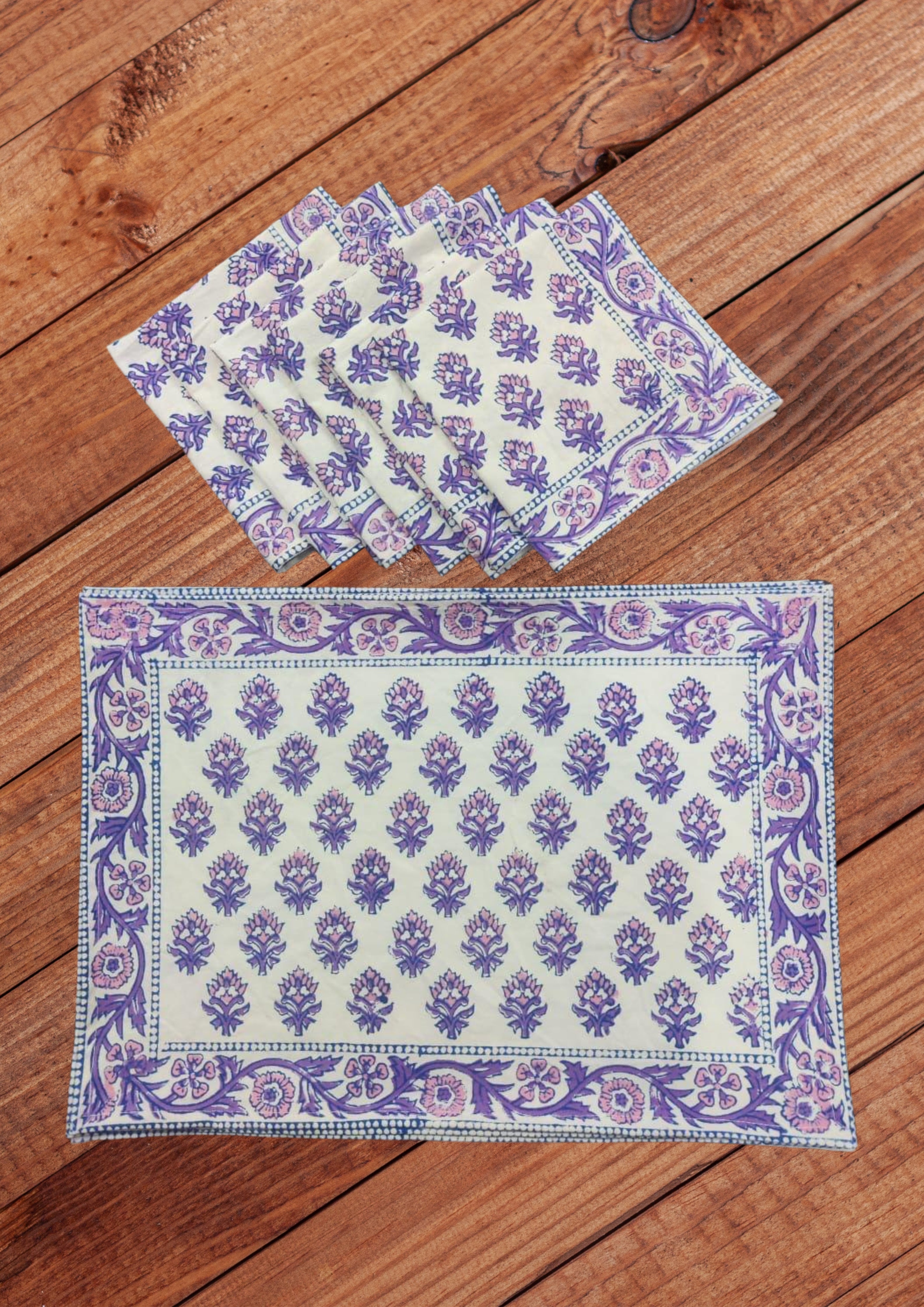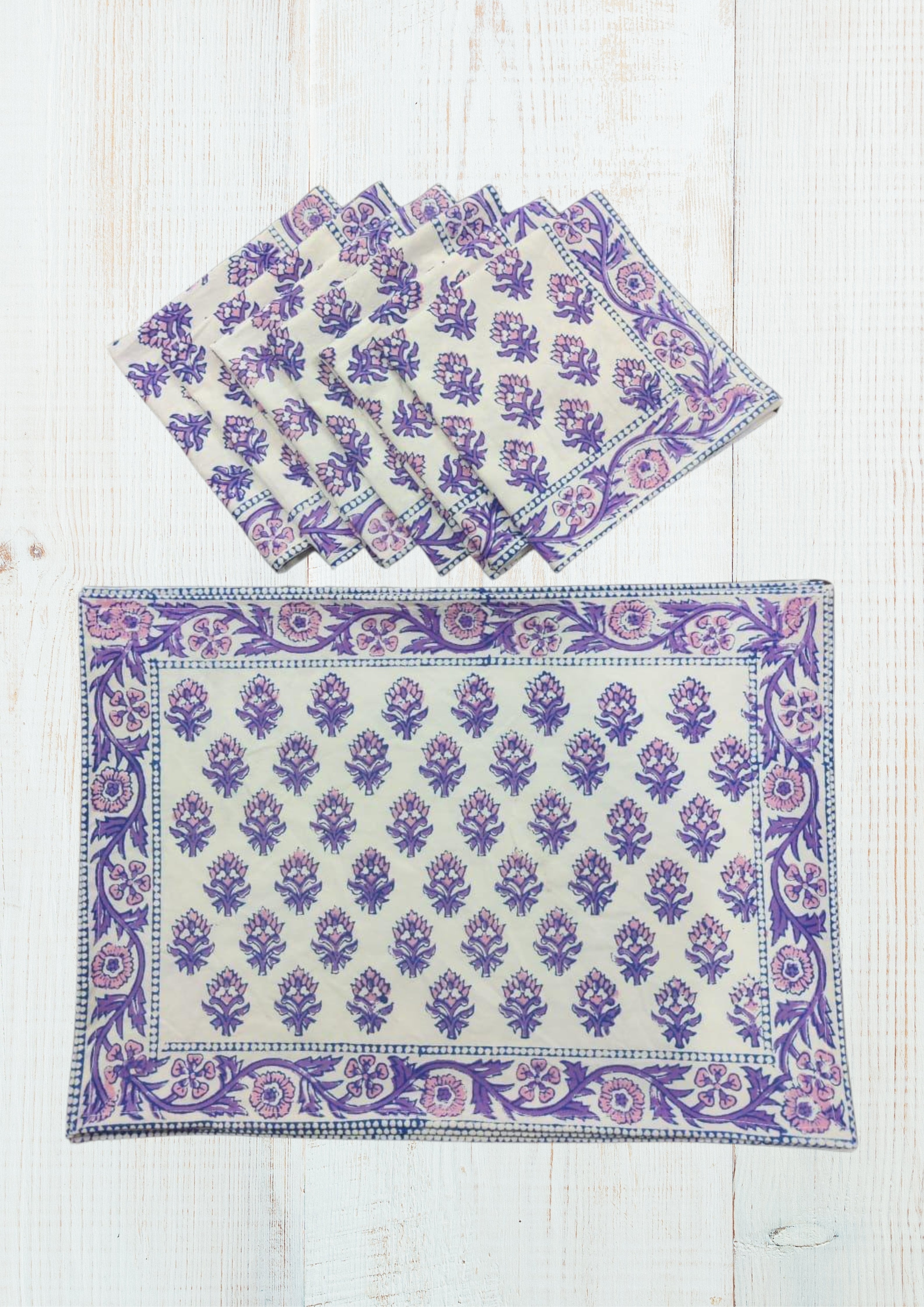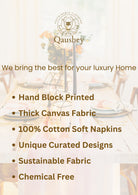 Handblock printed Canvas Table Mat and cotton Napkins. A beautiful collection of table mats and napkins handblock printed in Jaipur, Rajasthan distinguished by unique handblock printed motifs. These mats are perfect for any occasion from formal to casual adding to the appeal of the decor. Canvas Cotton Mats - 6 Nos, Soft Cotton Napkins - 6 Nos