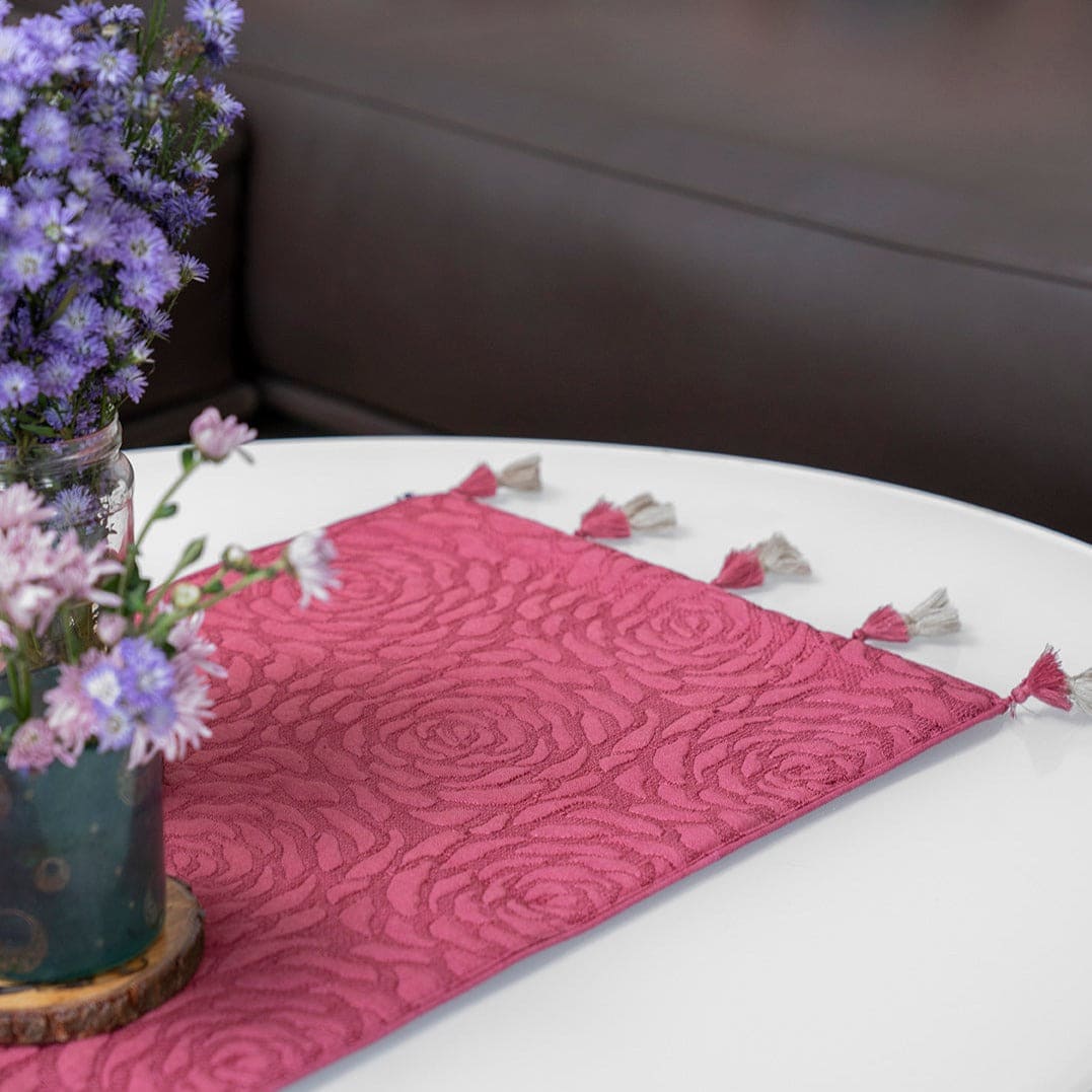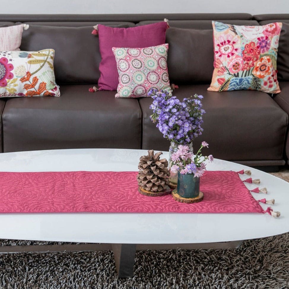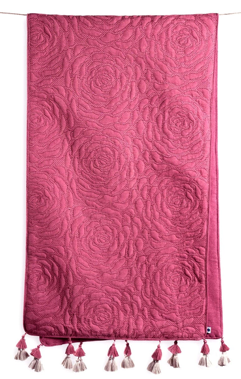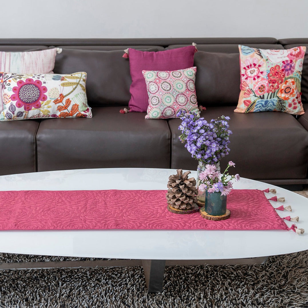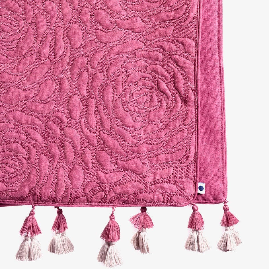 A dense rose landscape blooms over the surface of our Rose Garden Table Runner, bringing a refined and elegant edge to both everyday meals and special occasions. Quilt embroidery on cotton gives this runner a beautiful 3D texture, while a row of pompoms adds an interesting trim on either end.