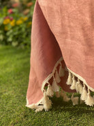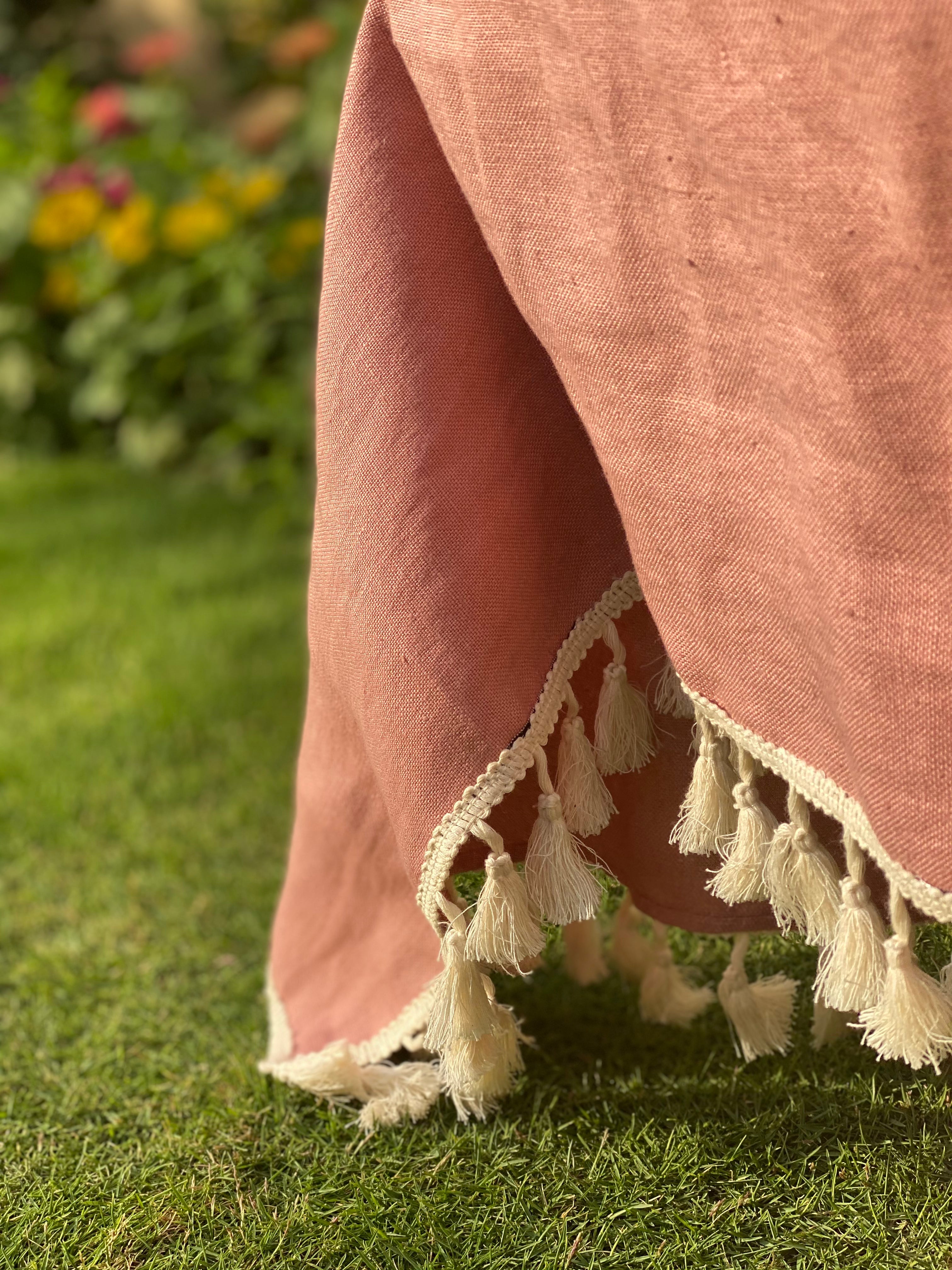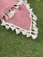 A soft pink pastel table runner with tassel lace detailing. Vihaan is a part of the Bhor collection and is inspired by the colours of the soft pink hues of the dawn.