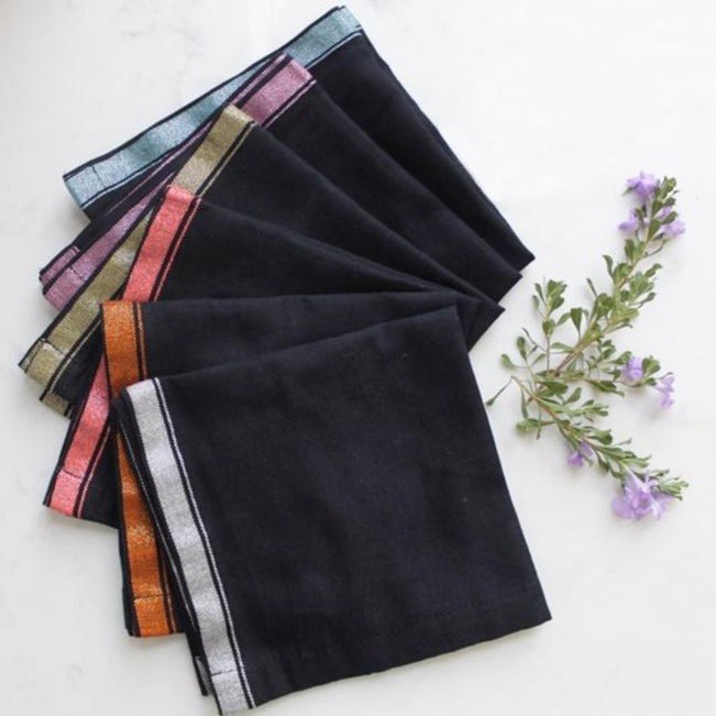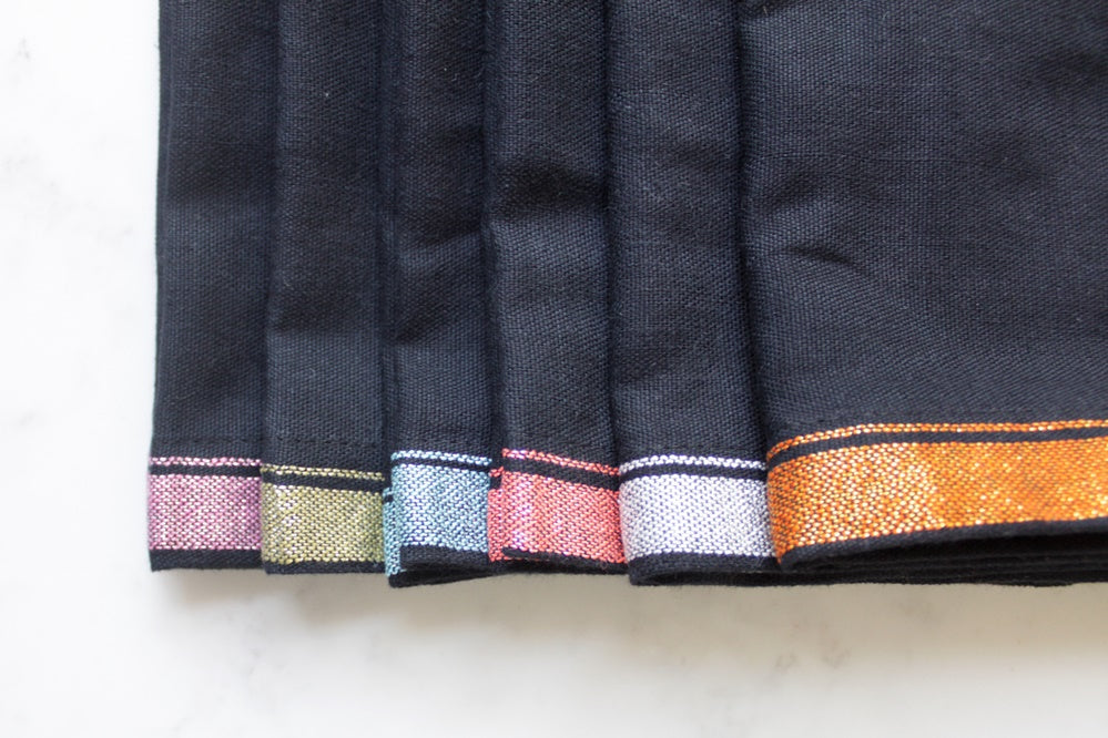 A graphic black napkin edged with a single metallic hued stripe to bring a lot of festive cheer to the tablescape.