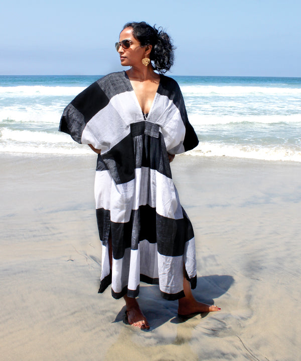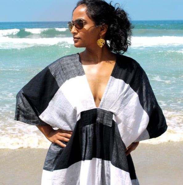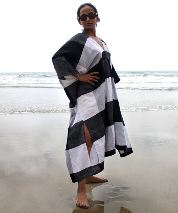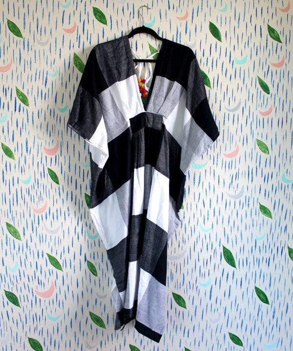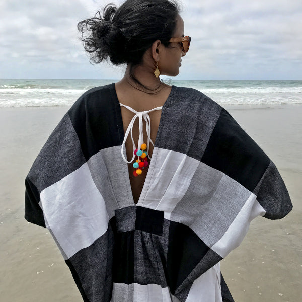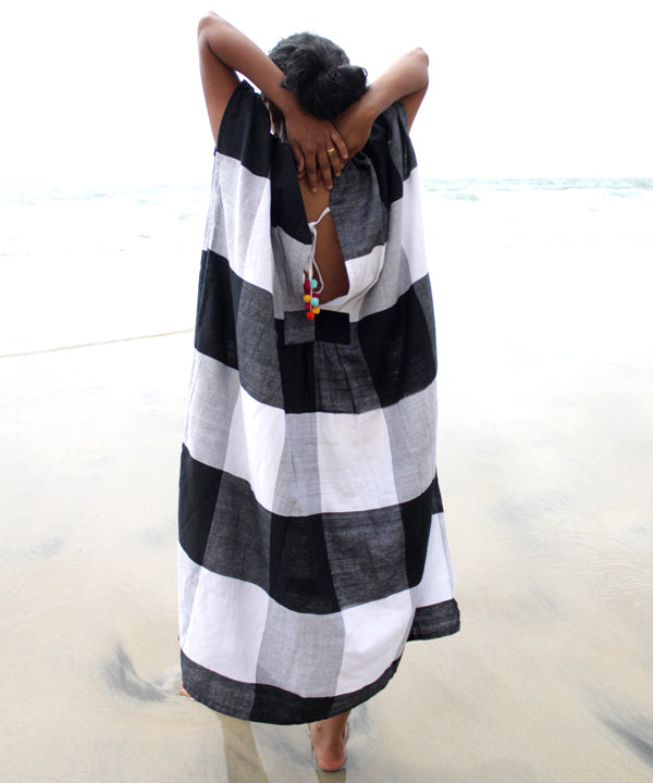 A bold black and white check pattern kaftan with a tie-back edged with colorful pompom detailing. This beautiful lightweight kaftan is woven with our signature thorthu fabric and has slits on both side.