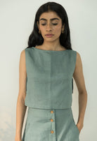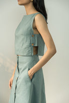 Designed for a sleeveless, cropped shape, it has a boat neckline and fastens with buttons either side to keep the silhouette minimal and sexy. Complete the look by pairing it with the matching skirt.