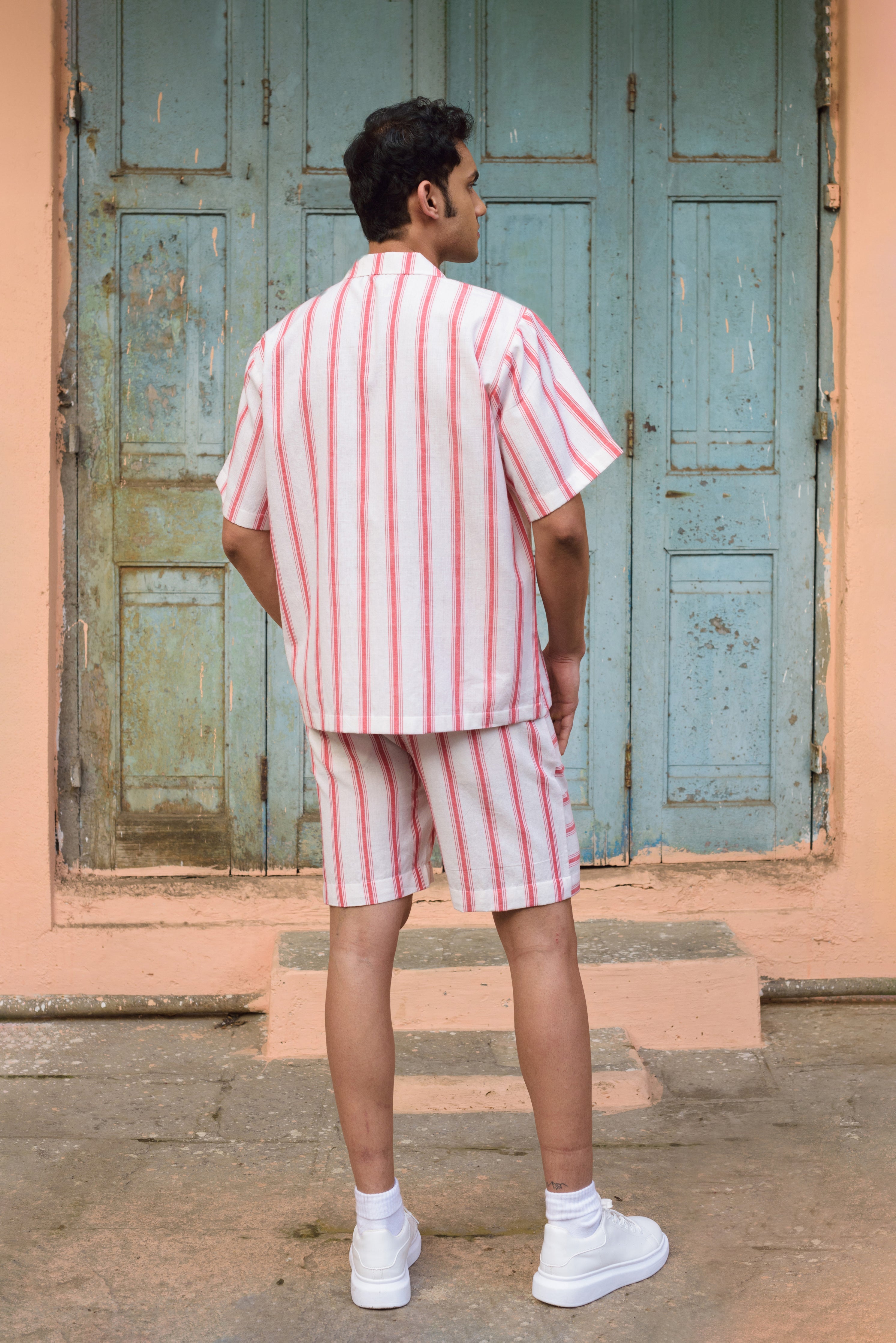 Description: Say hello to summer with our classic camp collar shirt in candy red stripes. Short sleeves. Finished with two patch pockets. Modern and minimal.