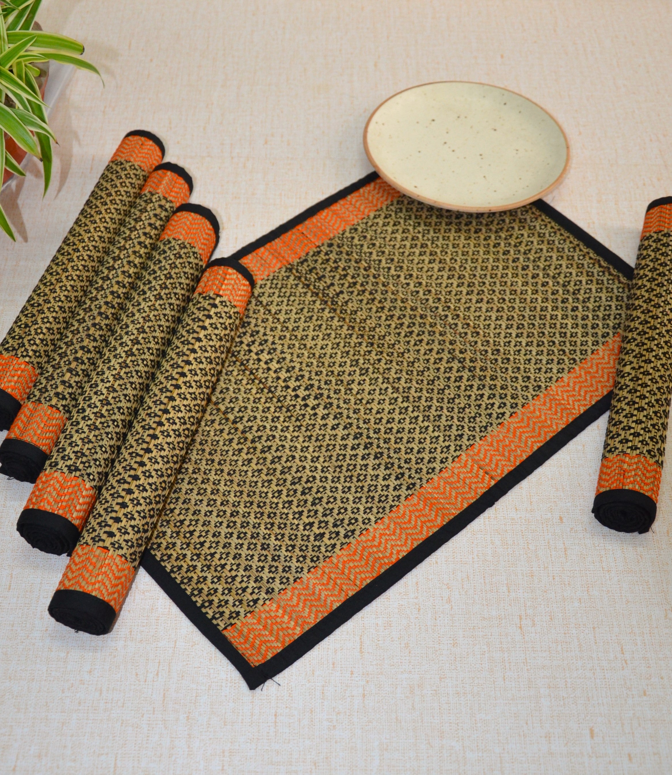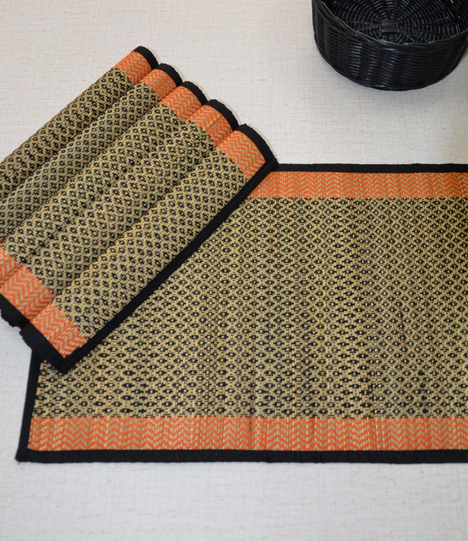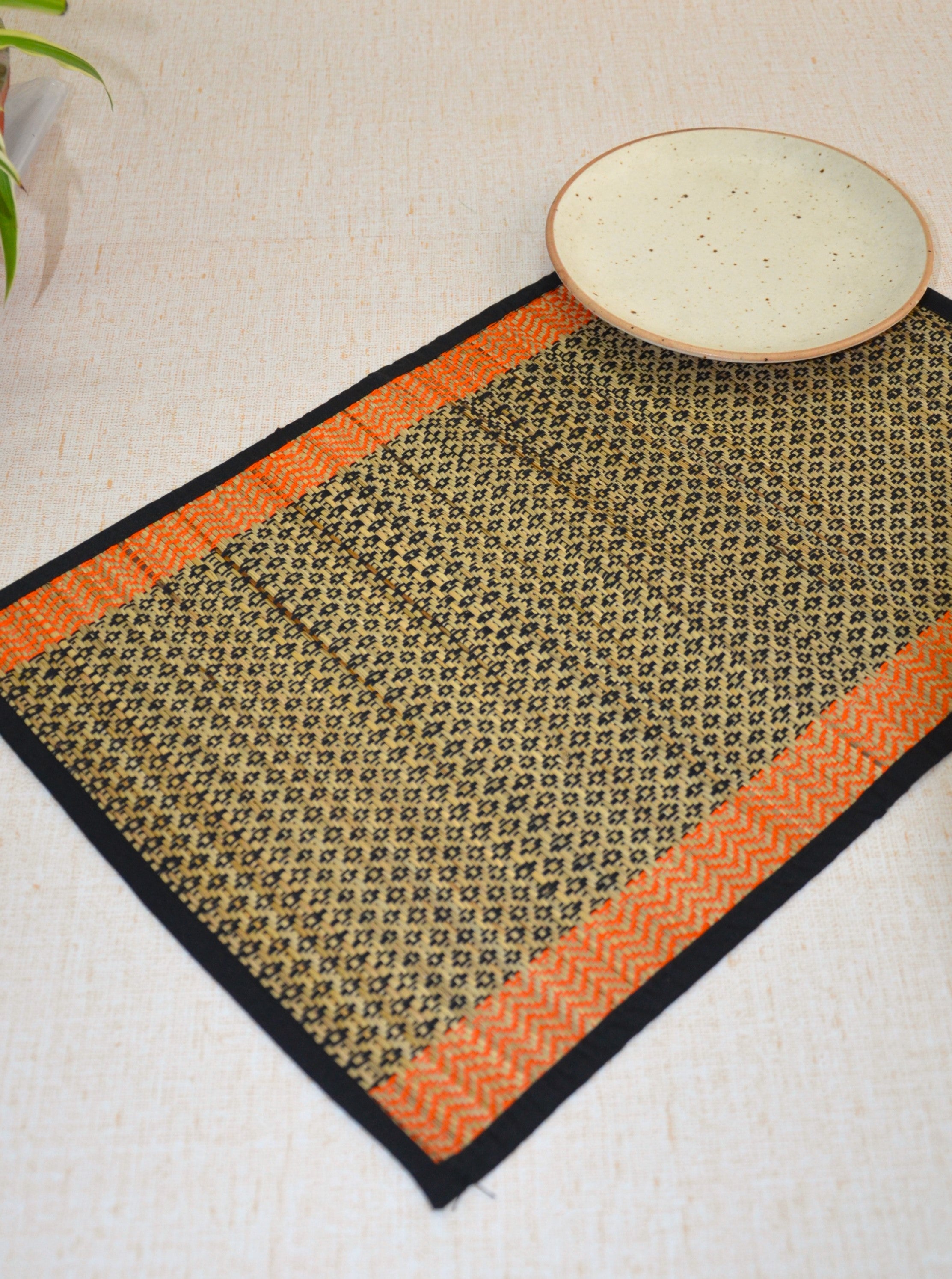Dharini Madurkathi Diamond Placemats Black Orange (Set of 6)