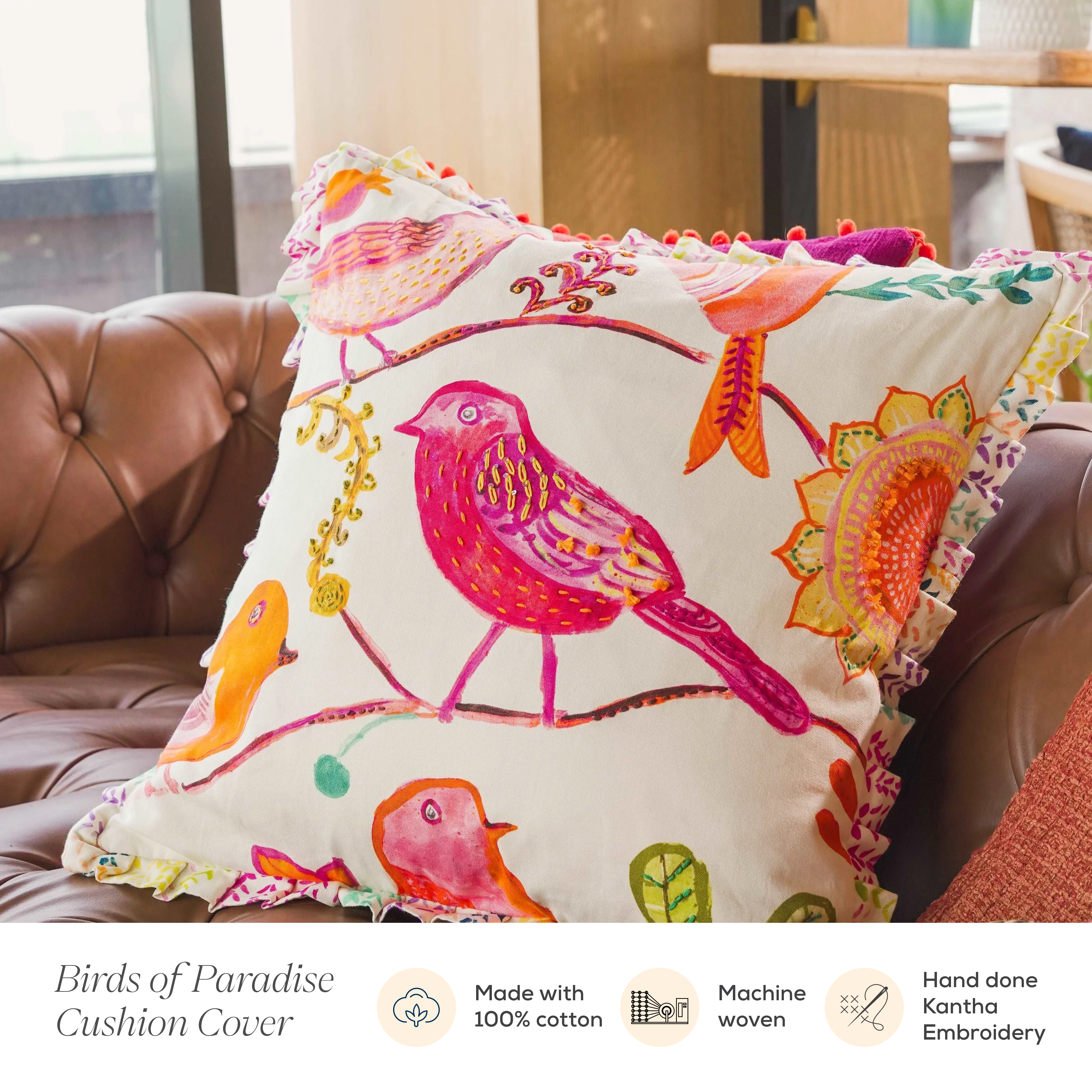 Humming into the summer season, this cushion cover cherishes the symphony of nature through the melodies of soulful songbirds in harmonious shades of pink. The Kantha stitch embroidery brings to life the intricate brushstrokes, capturing the artistic zeal of the talented hands. This cushion will add a hint of nature’s flair to your home space, creating an overall serene ambience.