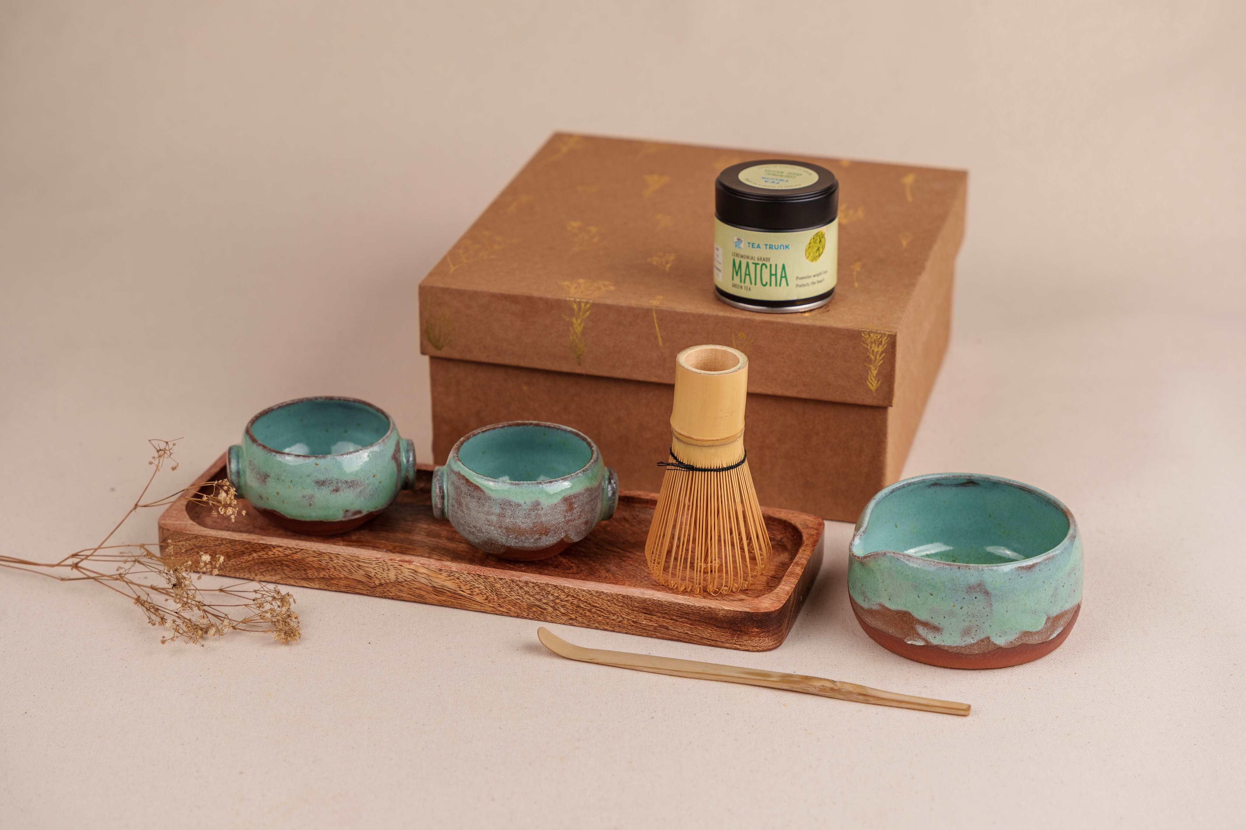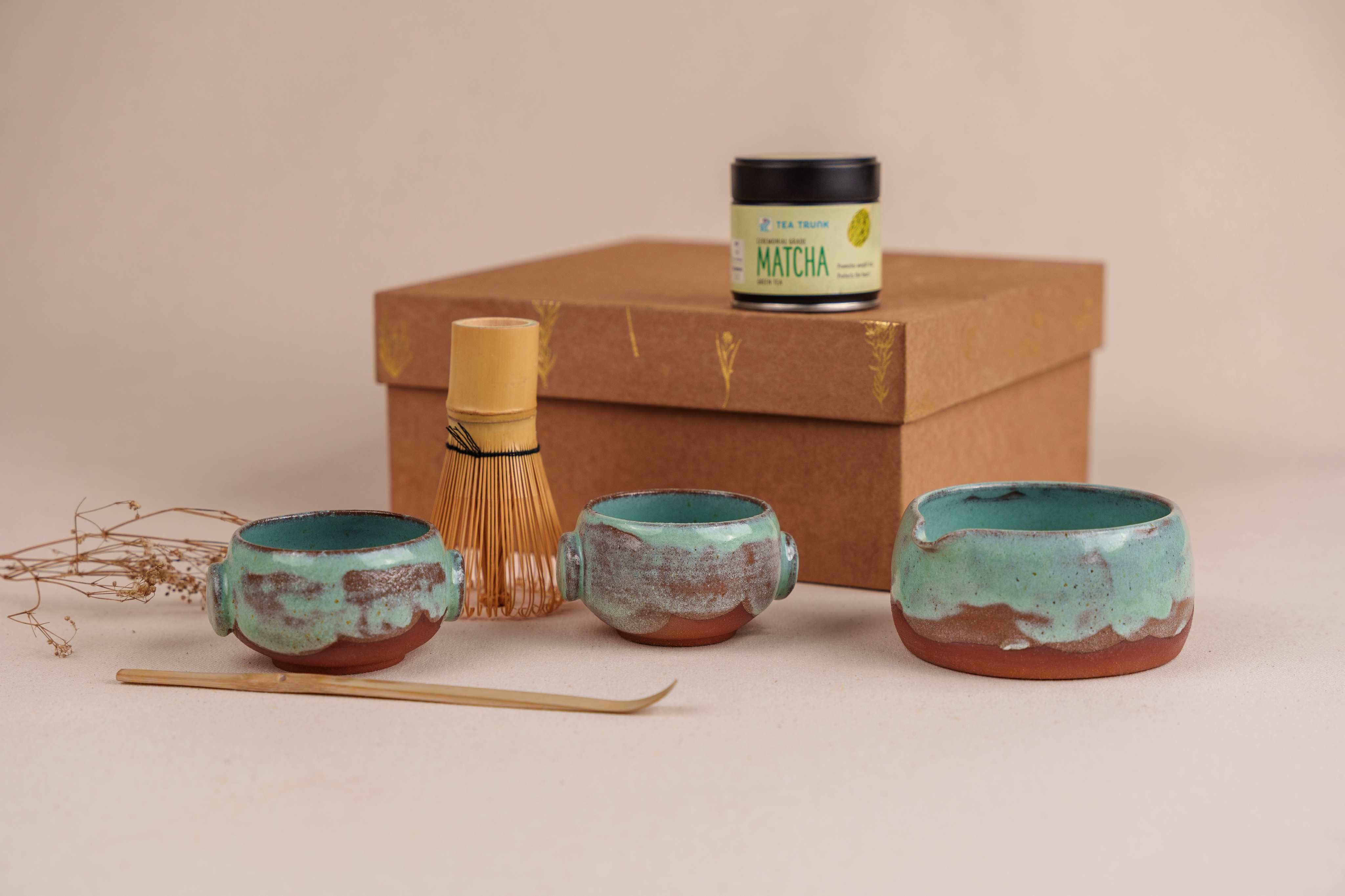 Crafting Technique The gift hamper contains: 1. Japanese Matcha teacups (set of 2) 2. Matcha bowl 3. Tea trunk Matcha green tea 4. Tea trunk Matcha bamboo whisk Brewing instructions: To 1g Matcha, add a little hot water. Whisk vigorously with the bamboo whisk, stirrer or milk frother until a thick paste is formed. Keep adding hot water in small amounts whisking with each addition (up to 150ml) until tea is frothy. Drink up! If you like a strong cup of Matcha, add one more teaspoon of Matcha into the mix. Note: Our ceramic dishes are completely handmade by local artists with stoneware clay and finished with in-house glaze. Hence, each piece has its own individual shape, personality, and irregularities. All dimensions are as accurate as possible. However, as with any hand-built item, there could be some variations in size between pieces.