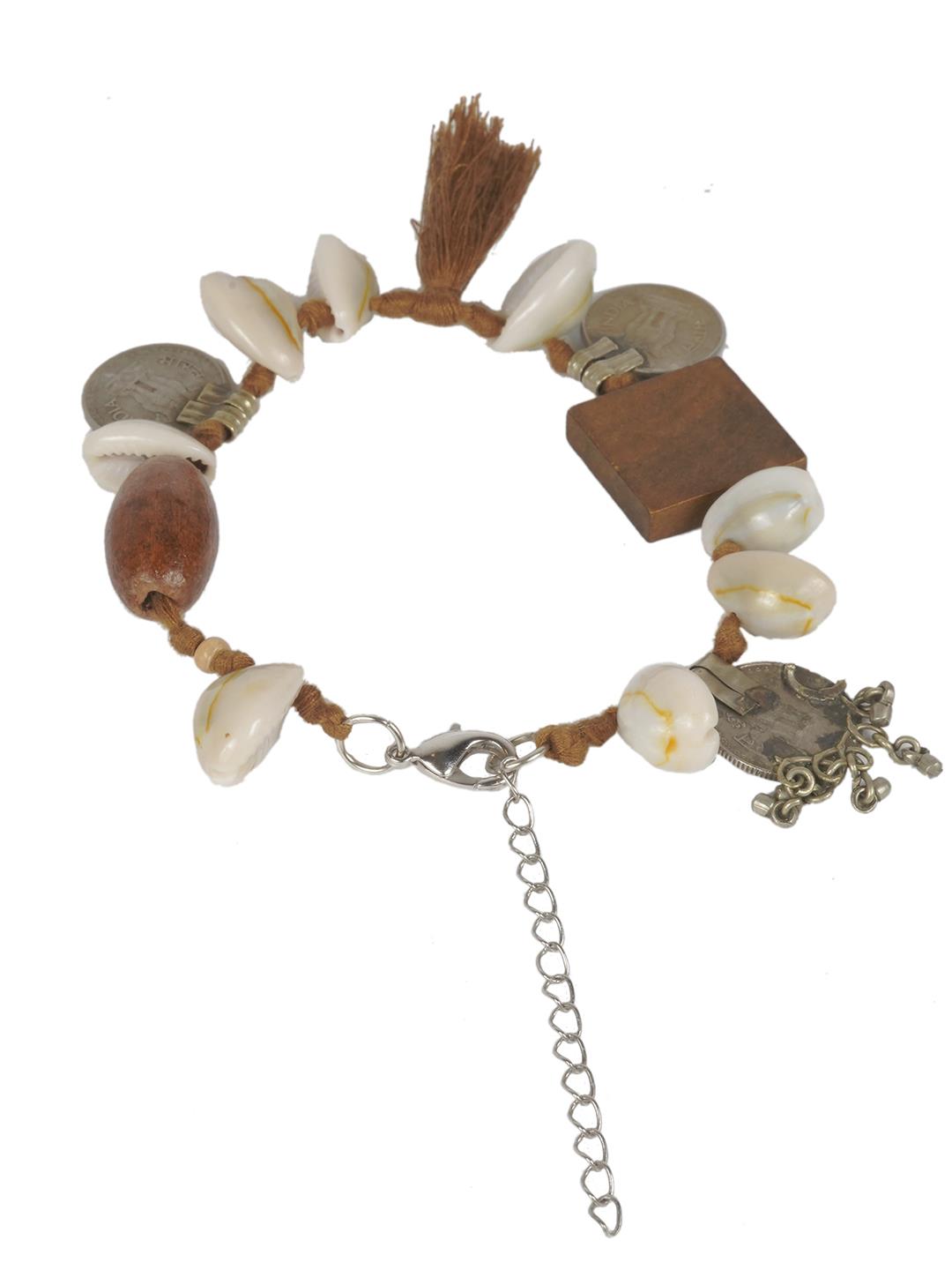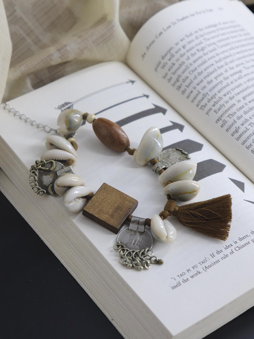Handcrafted bracelet made from wooden beads, upcycled coins and thread tassel