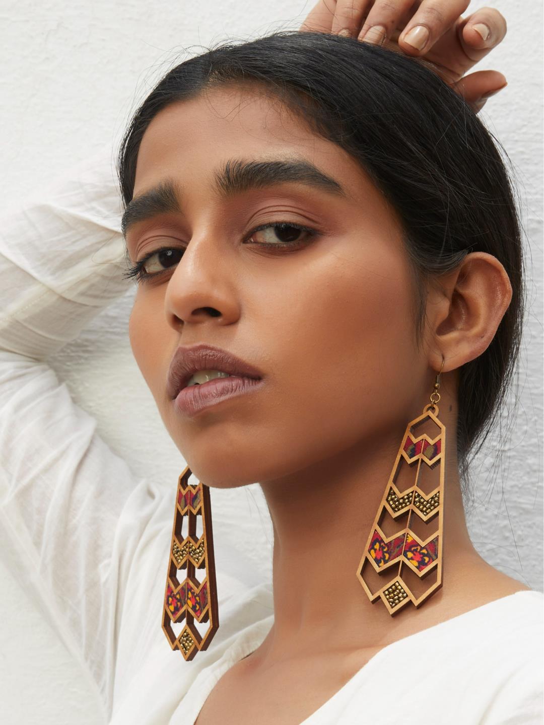 This handcrafted earring is made using Fabric, Repurposed Wood Frame, Glass Bead