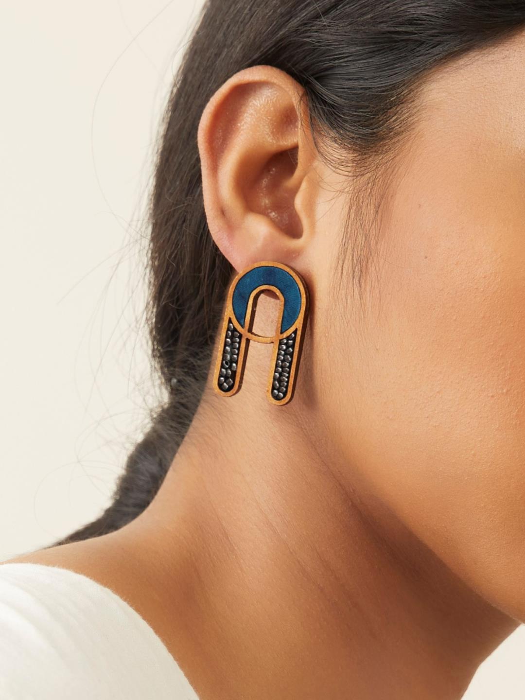This handcrafted earring is made using Fabric, Repurposed wood, Glass Bead.