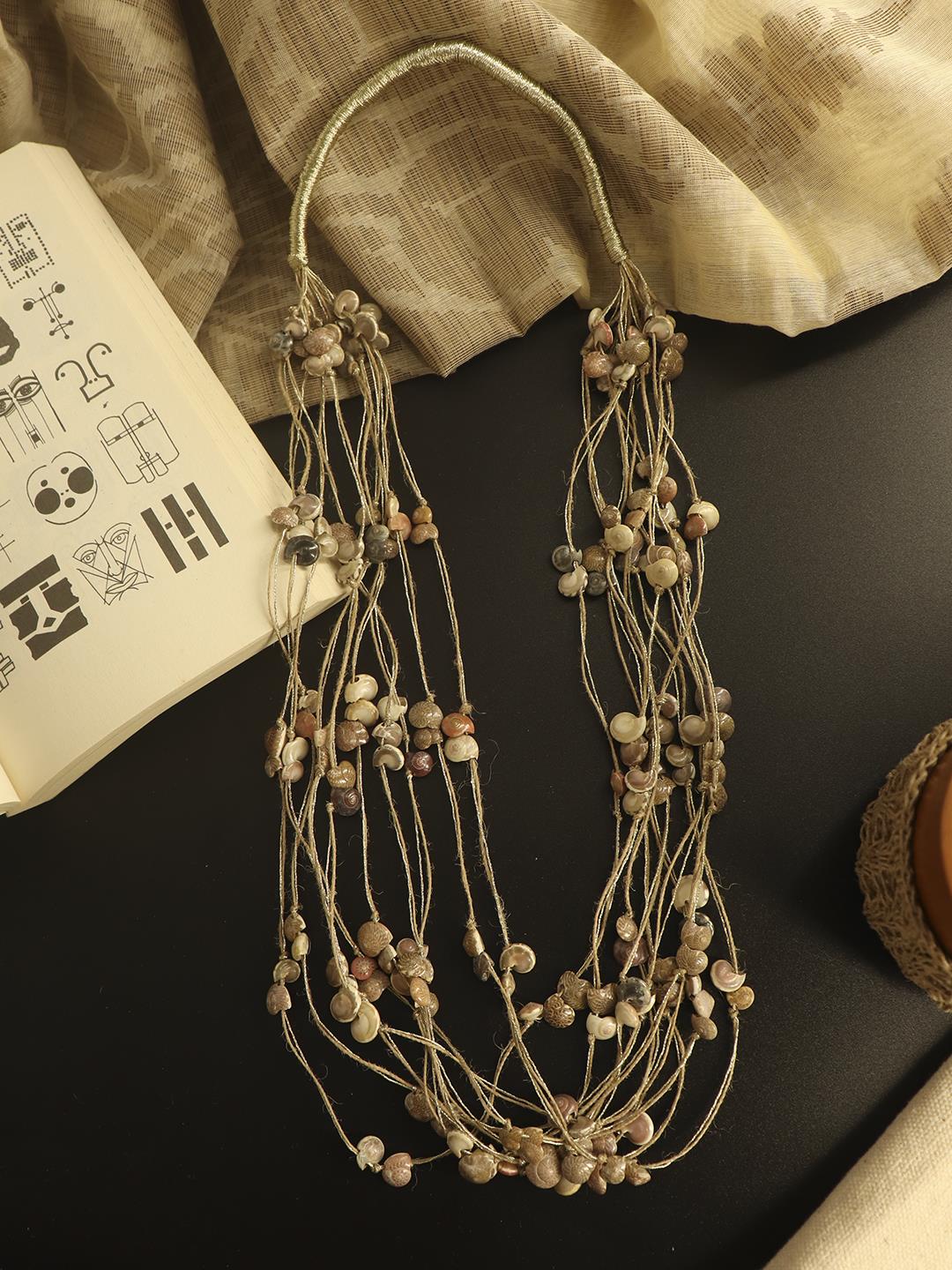 Handcrafted layered matinee necklace. Shells beaded along jute and zari strings, completed with zari thread wrapping Whe by Abira is a design-driven, ethical fashion accessories brand, committed to bring marginalized families out of the poverty cycle and inspire consumers to buy eco-friendly and handmade products. We ensure a fair family investment in education, health, and savings by adding mothers to the workforce and doubling their family income