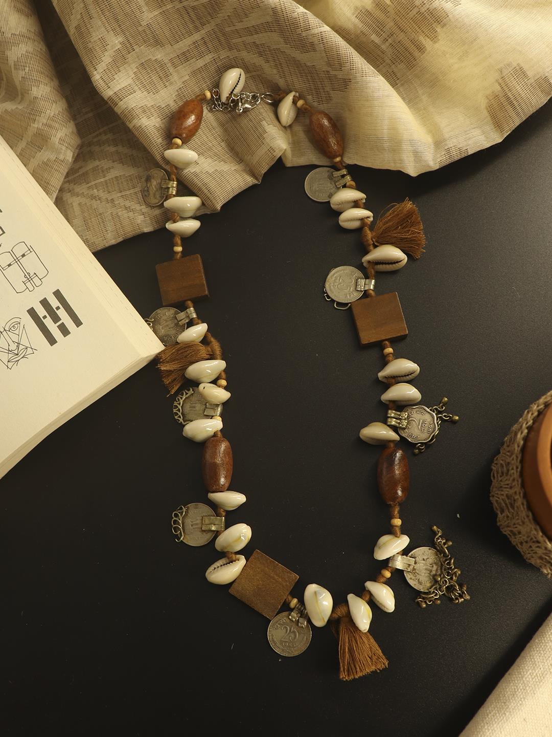 This collection comprises of warm flamboyant jewellery pieces in neutral tones. Use of shells with elements like jute and metal coins gives it a very rustic look.