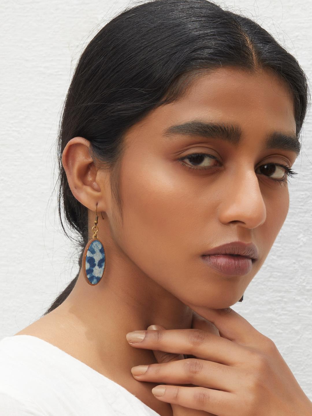 This handcrafted earring is made using Fabric, Repurposed wood, Glass Bead.