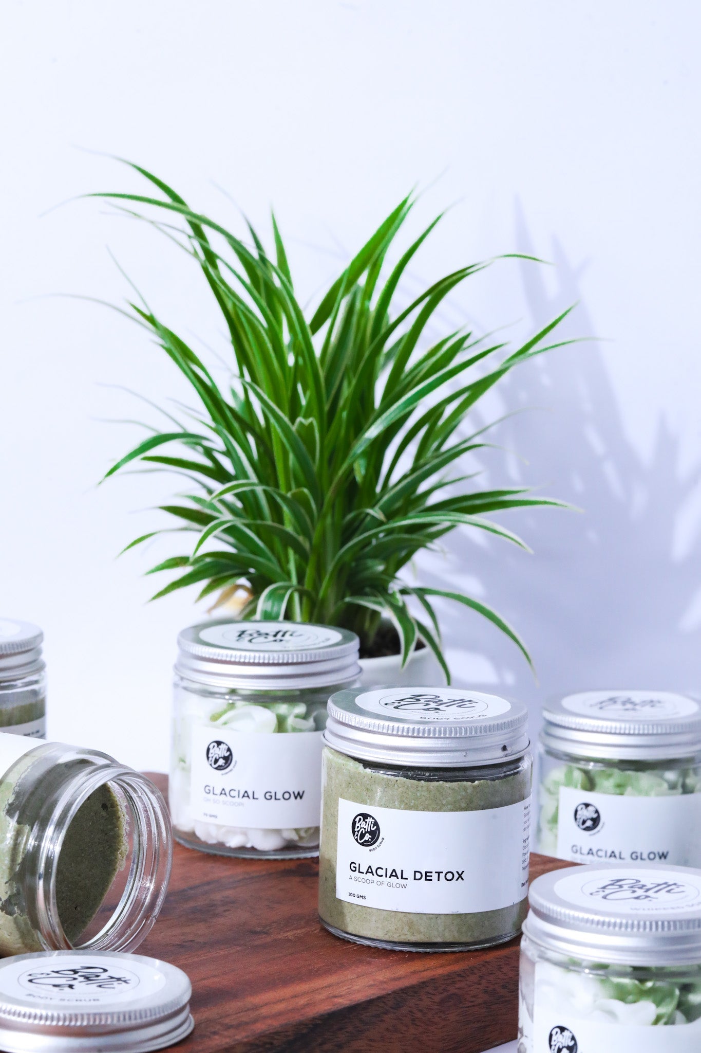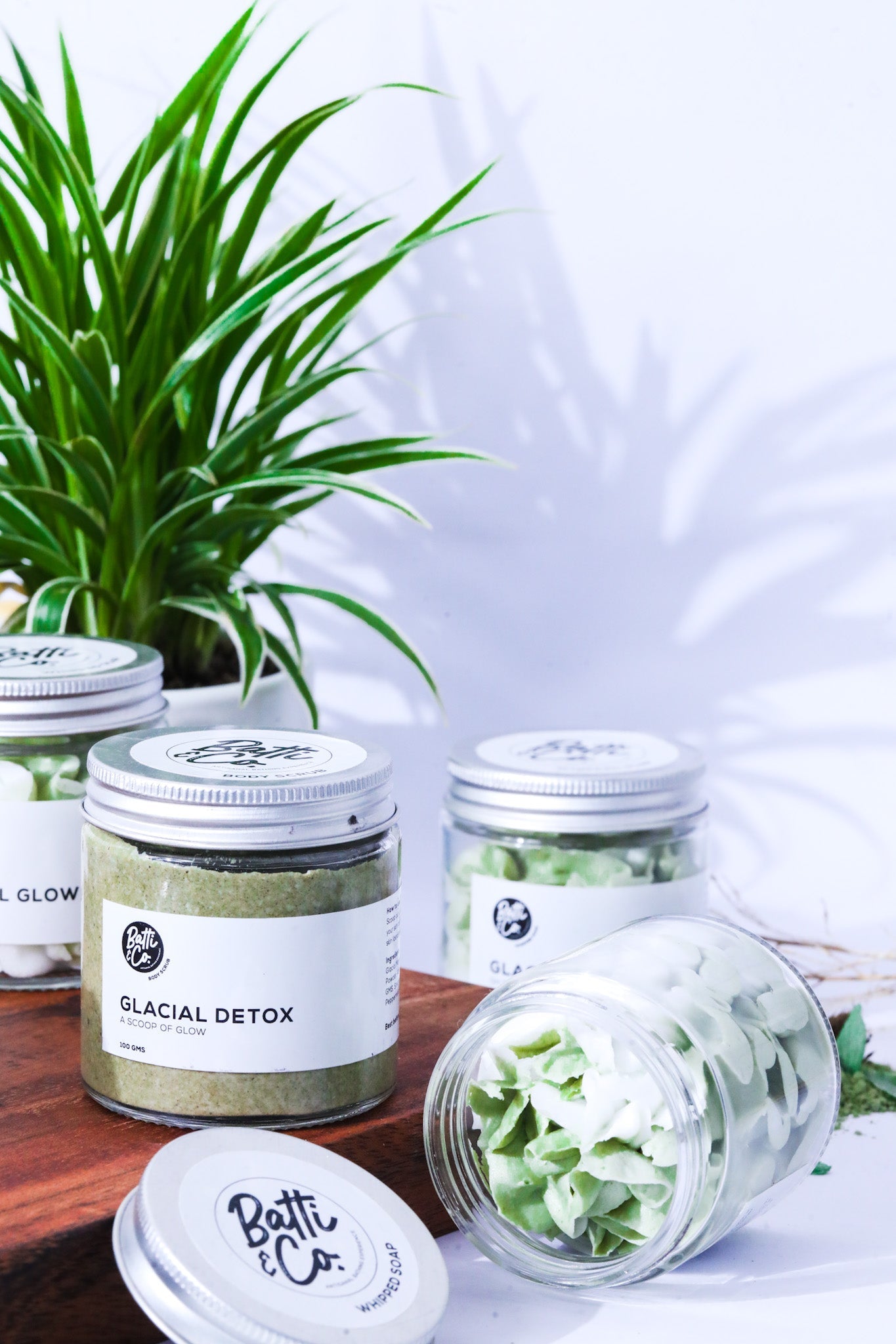 Glacial Detox : Glacial Marine Clay, Fuller's Earth Clay, Walnut Shell Powder, Aqua, Vegetable Glycerin, Xanthan Gum, GMS, Stearic Acid, PhenoxyEthanol and Peppermint Essential Oil.