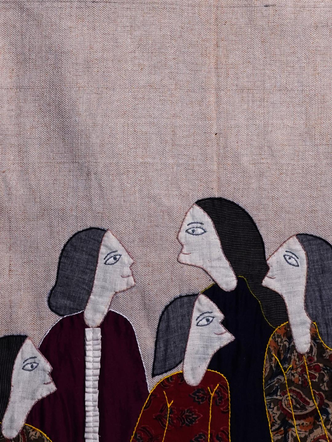 Jute bag with handwork human face motifs on front.