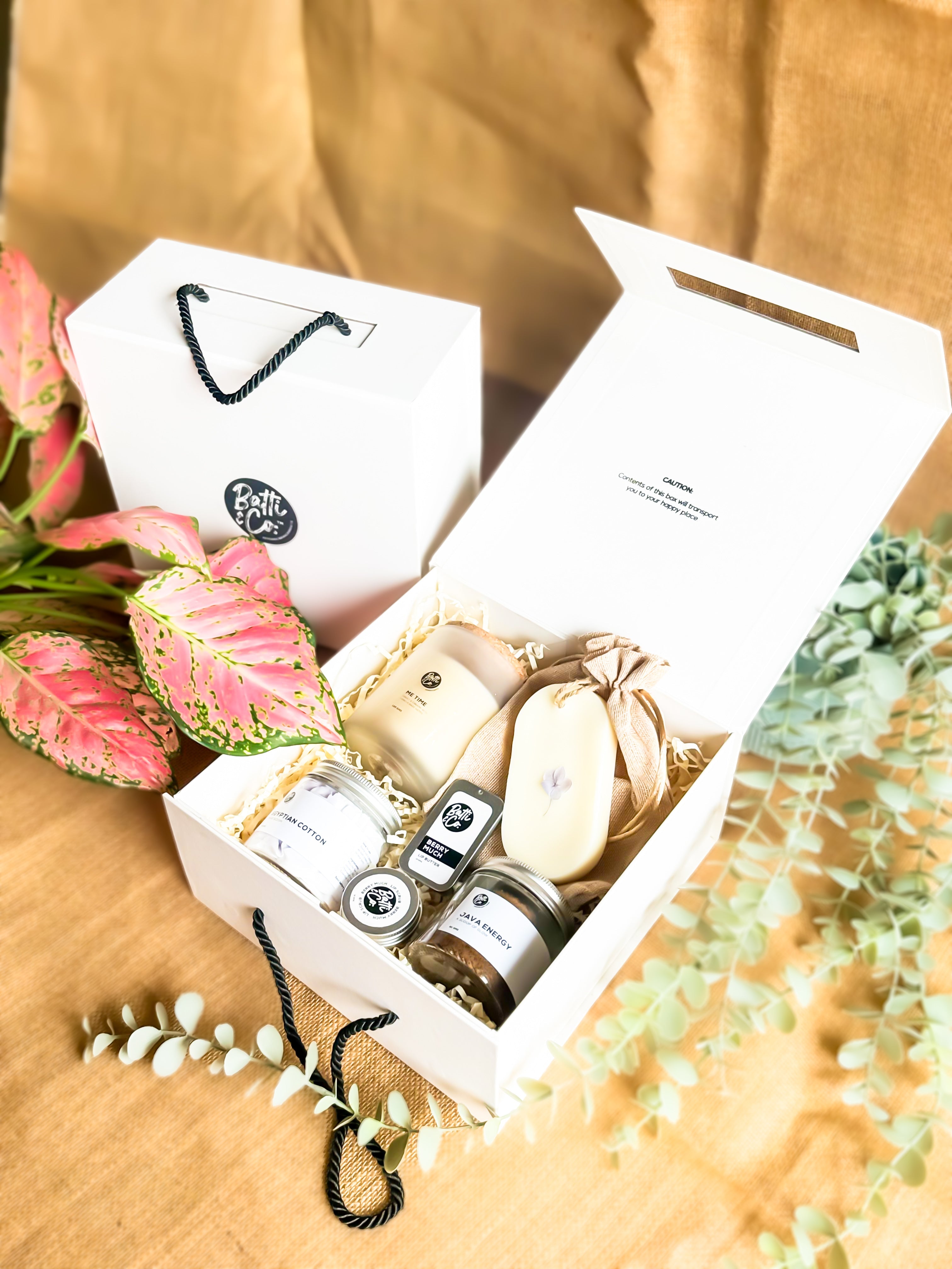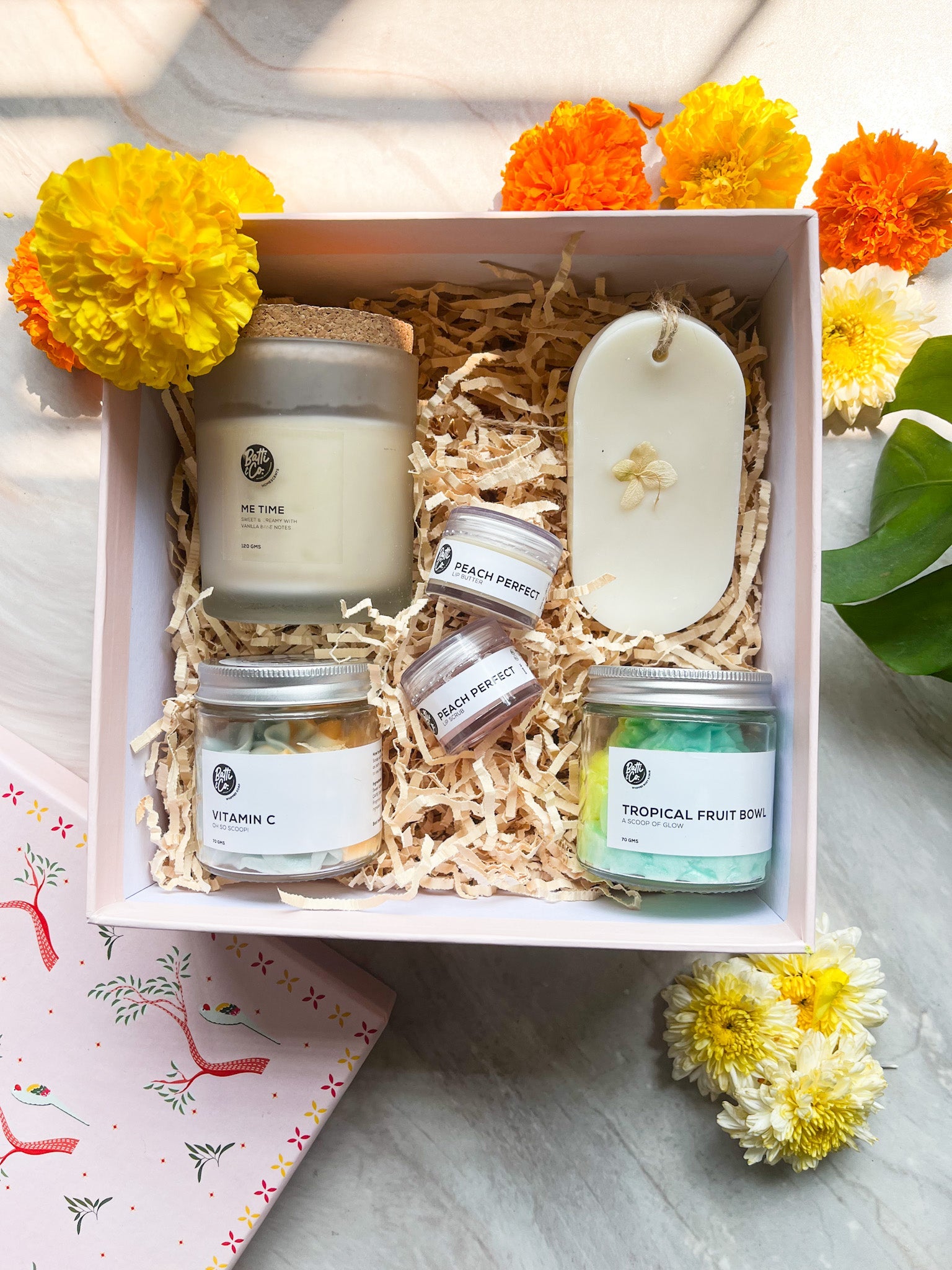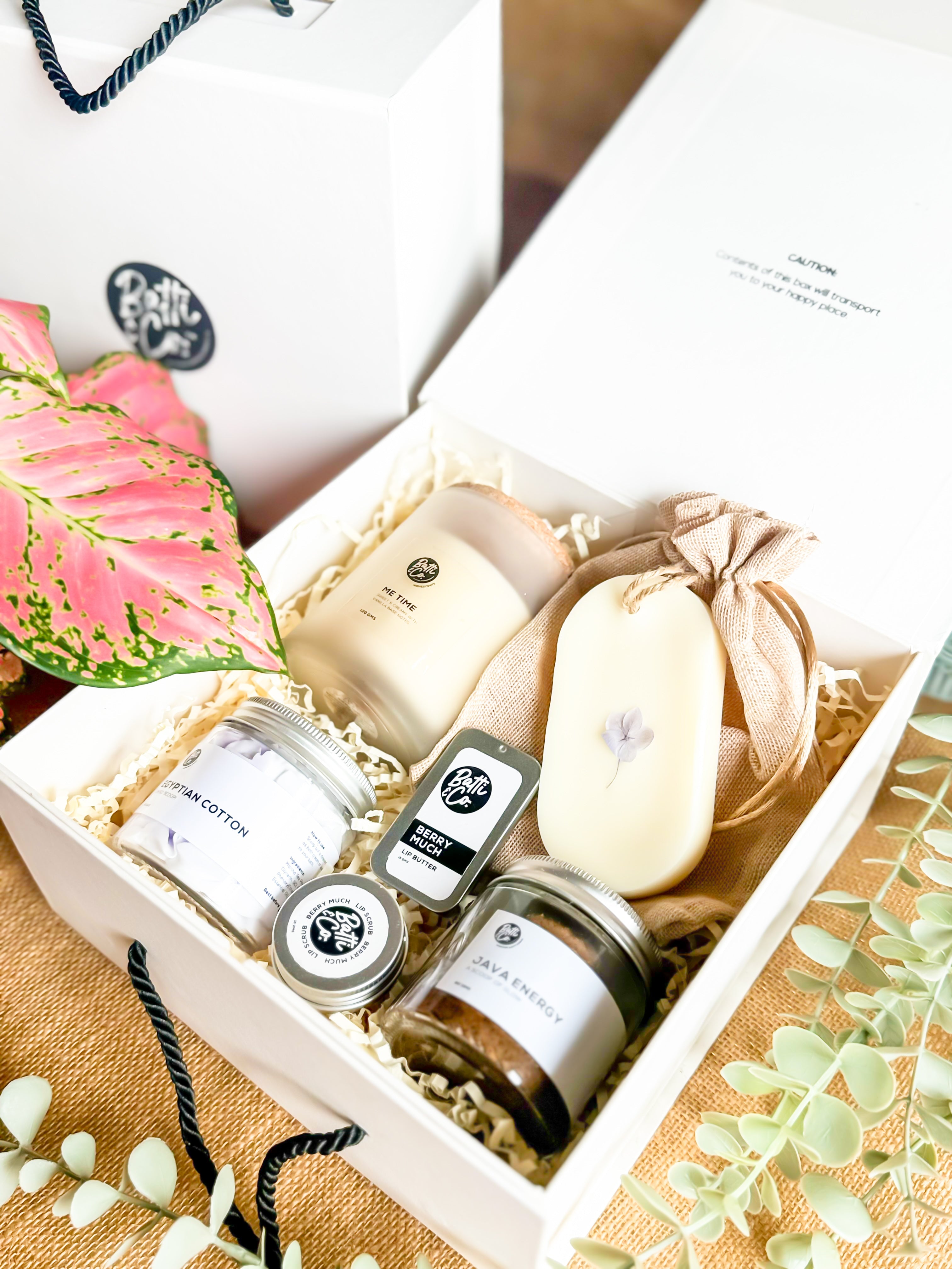 Indulge in a world of relaxation and self-pampering with our Me Time Gift Box, thoughtfully crafted to elevate your senses and nourish your skin. Inside this beautifully curated box, you’ll find a selection of handcrafted, vegan products made with skin-loving ingredients. Let’s take a closer look at what’s included: