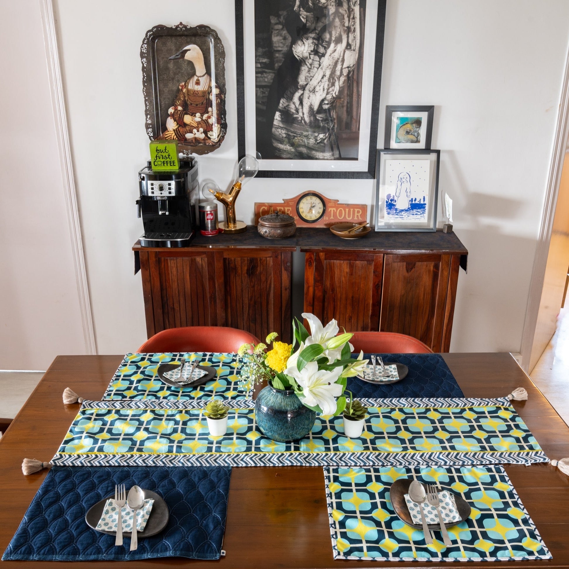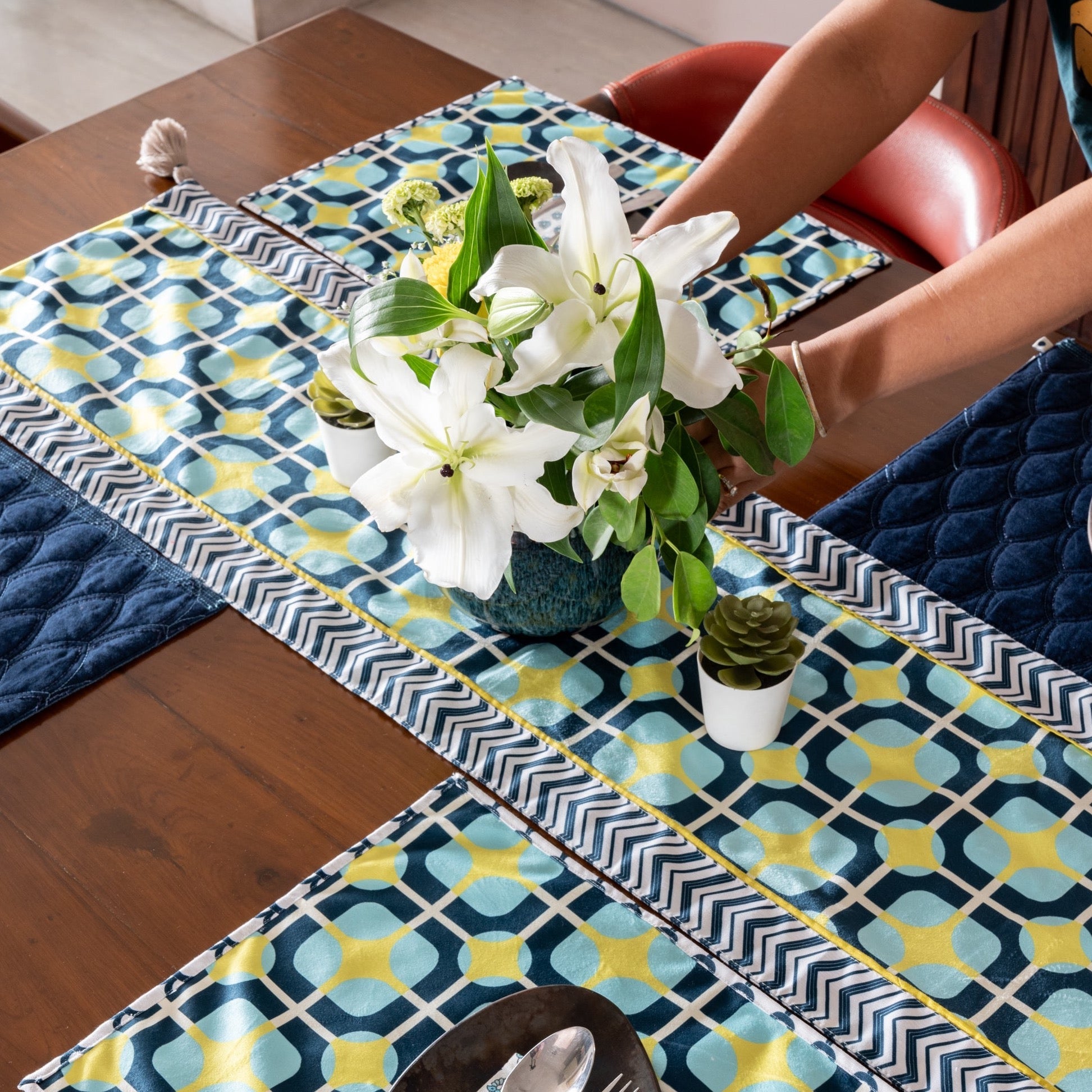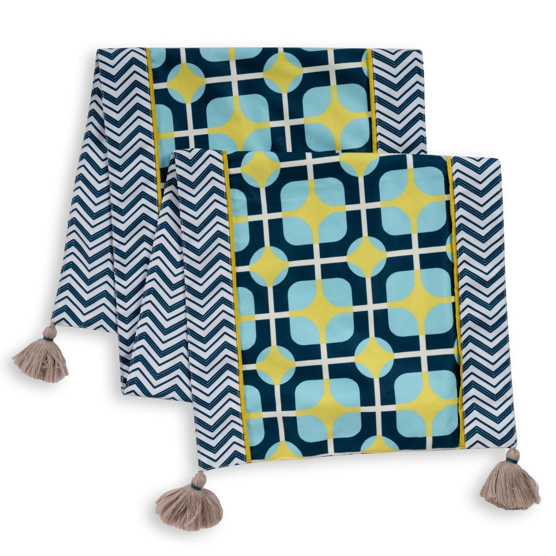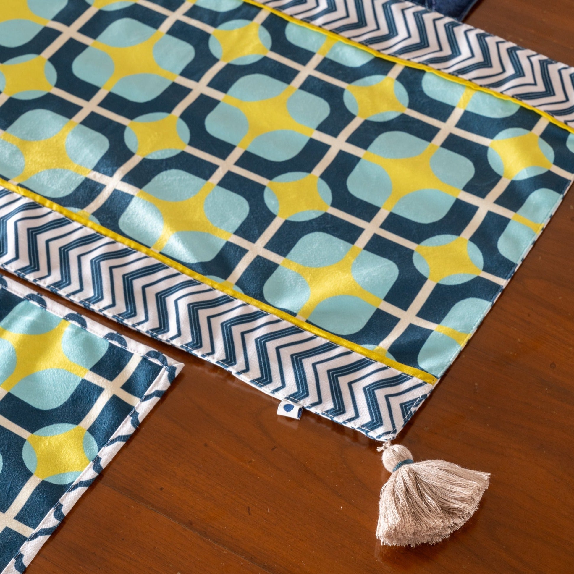 A captivating fusion of pink and purple hues that brings a touch of enchantment to your dining experience. This exquisite table runner is adorned with a mesmerizing geometric pattern, carefully curated to infuse your dining space with a sense of modern charm and vibrant elegance.