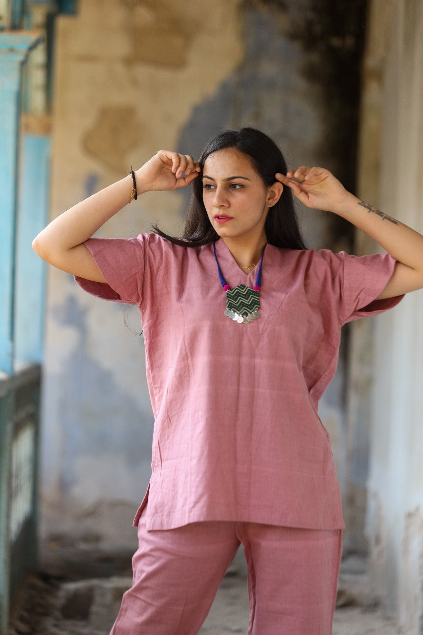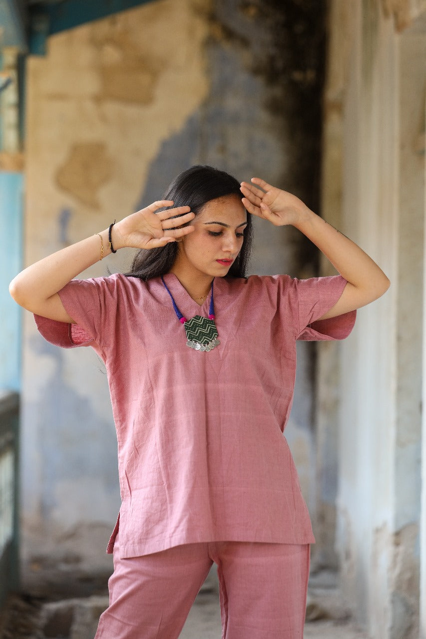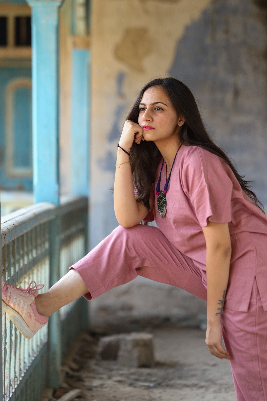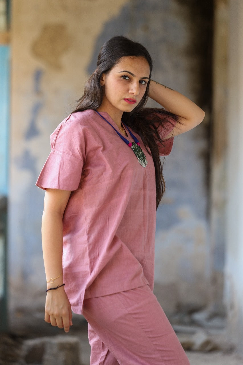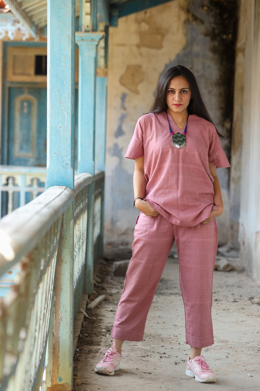 Ambala Khadi Plain Top with Pant in Peach Color is a great choice for office wear. This top is designed to look stylish while also being extremely comfortable. Its fabric is crafted using pure cotton, this allows the wearer to feel cool and relaxed.