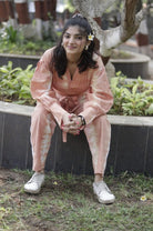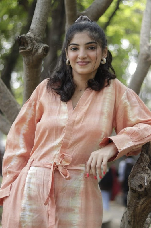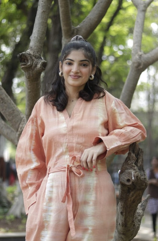 This jumpsuit is the perfect way to express your unique style. This tie and dye Jumpsuit is made of high-quality khadi fabric, which gives it a vintage look. Tie dye gives off raw color, while the simple design makes it a versatile piece. It's perfect for any outfit, day or night!