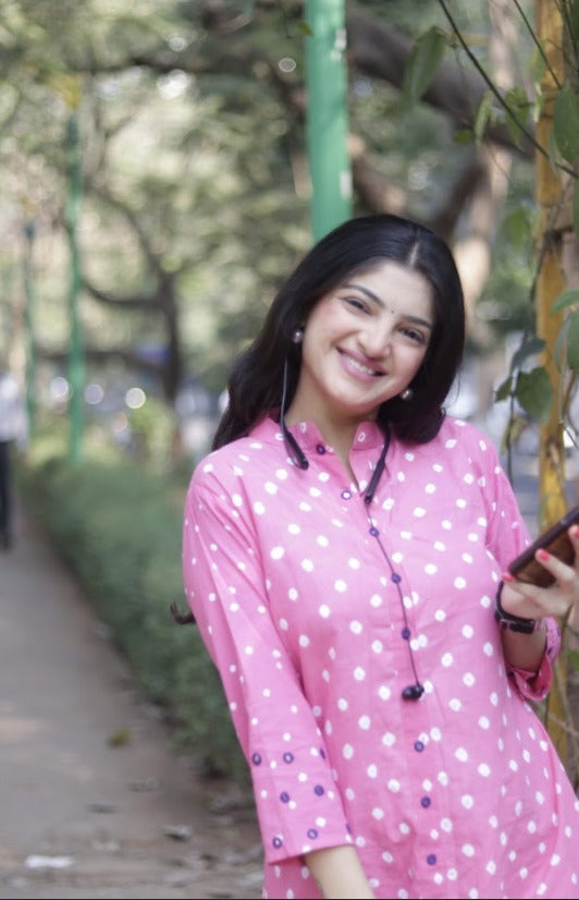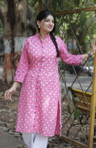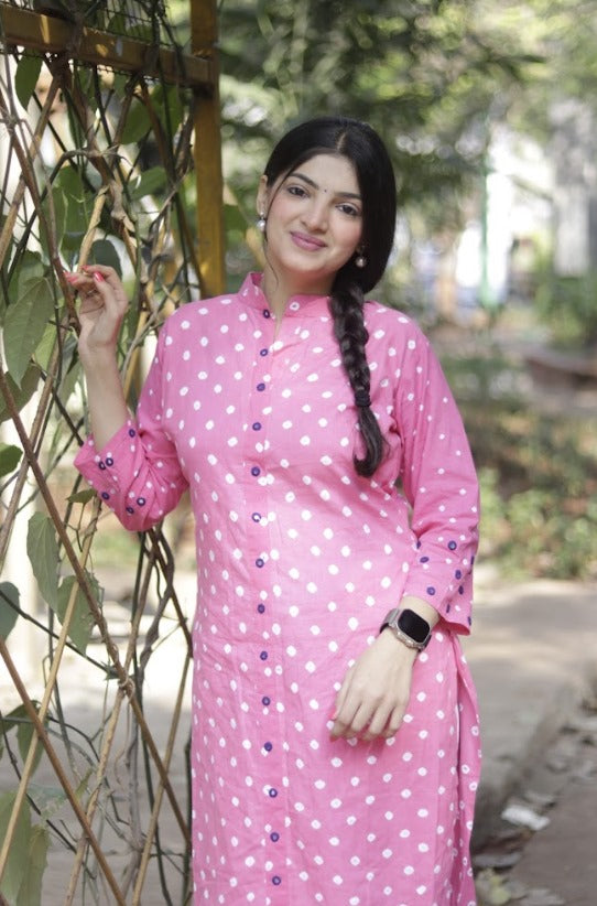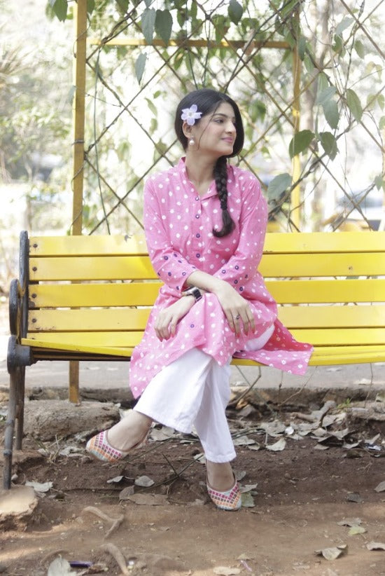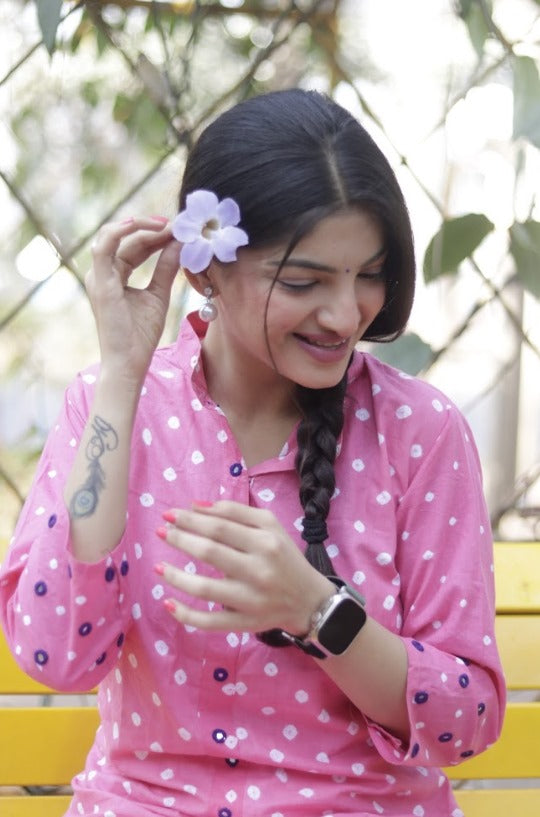 This Khadi muslin bandhani kurti is simply beautiful, with intricate and detailed work. The timeless look is reminiscent of our heritage, while the soft fabric makes it perfect for layering over your favorite outfits.
