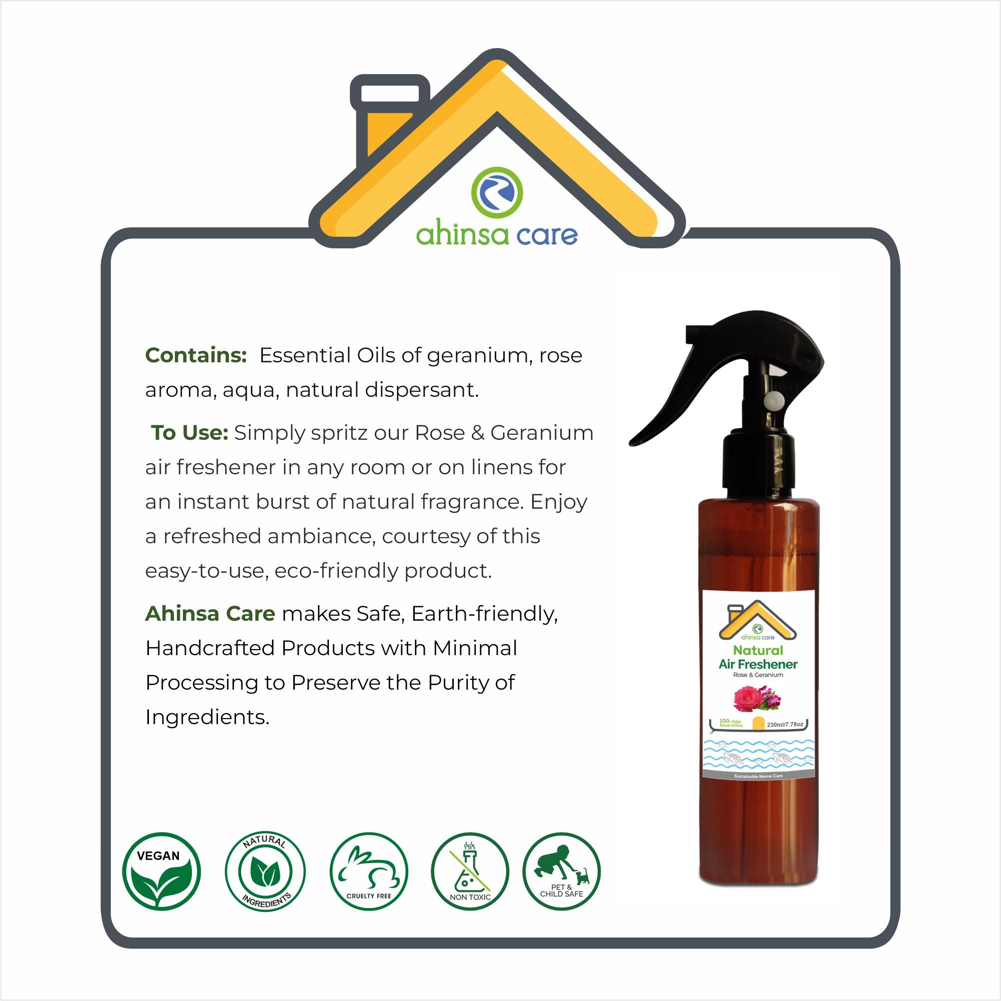Introducing Ahinsa Care Natural Air Freshener, for a fresh and inviting home environment. Crafted with care using natural ingredients, our air freshener offers a delightful scent that rejuvenates any space.