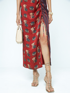 Description: A ruched maxi dress in modal featuring the Gentle Giant print, elevated with striped side panels for contrast. Designed with a draped effect around the waist and hip and a mid-thigh slit, it blends movement and structure for a refined, occasion-ready silhouette.