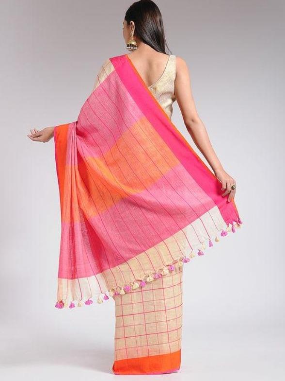 Sonal Kabra A linen saree with in ivory-orange-pink checks