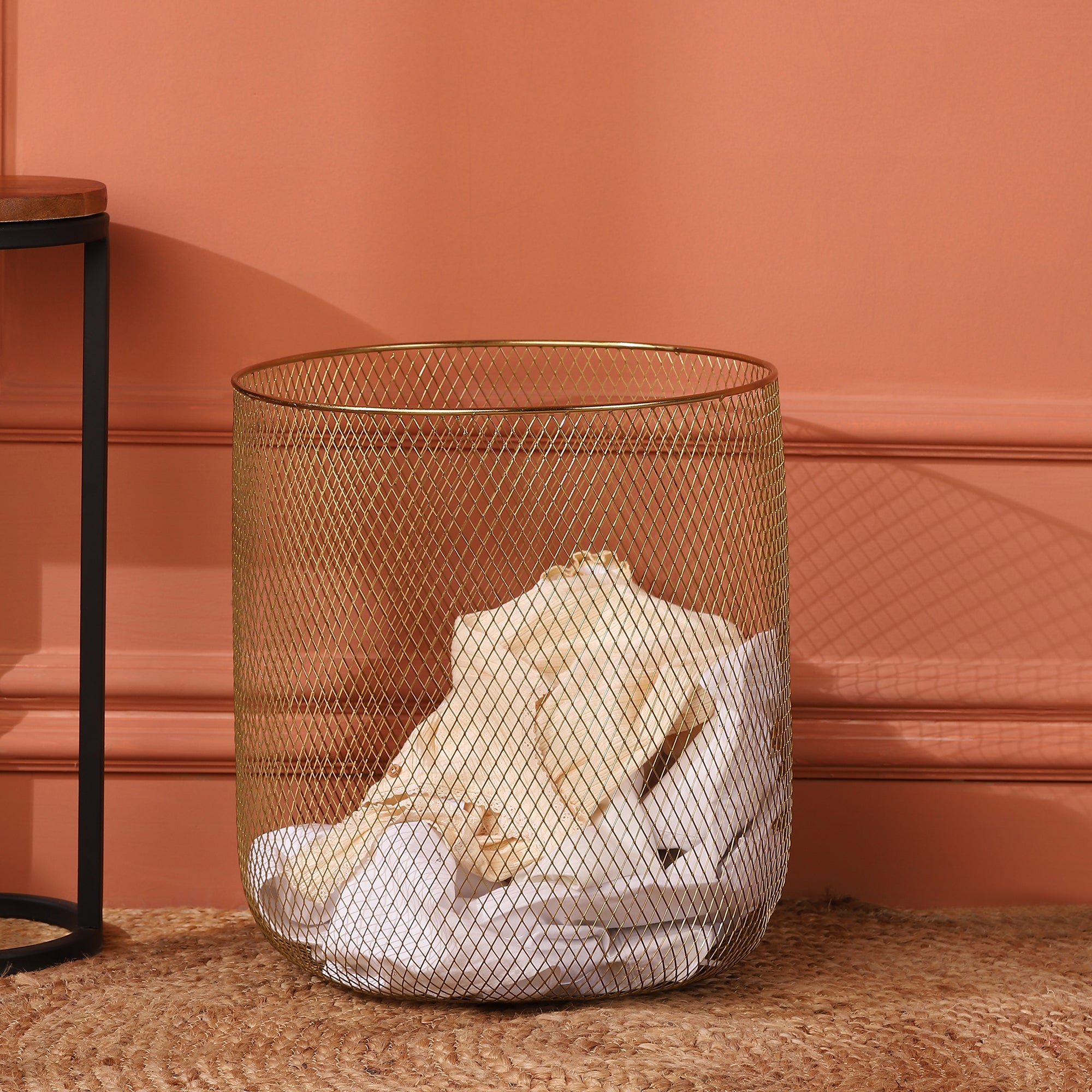 Maintain your home or office spaces neat and clean with this elegant brass-plated iron wastebasket suitable for paper waste and clothing. Give a permanent place for your dirty clothes or extra supplies.