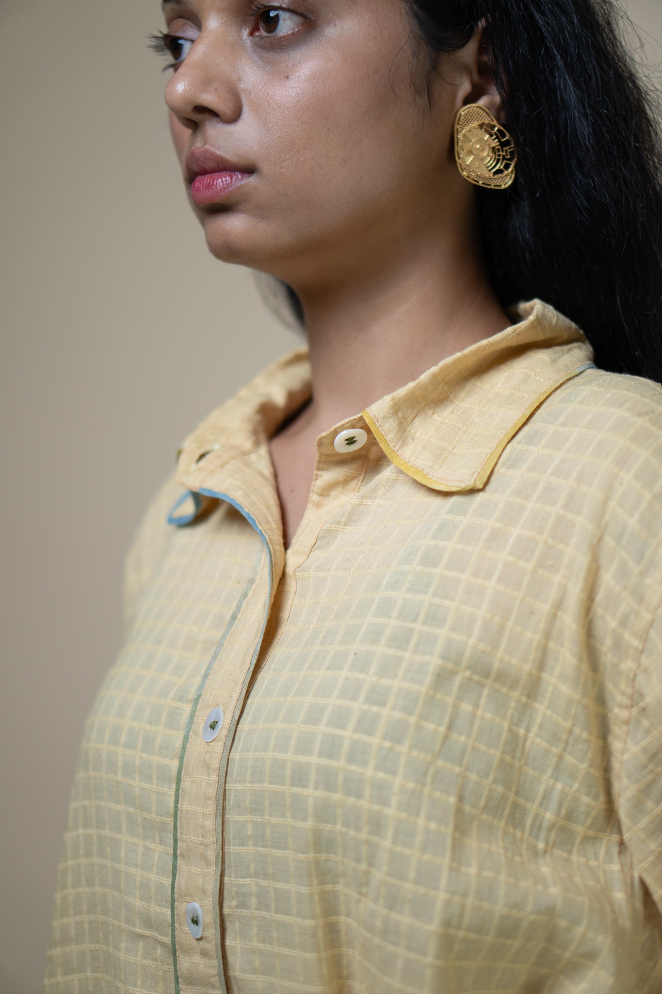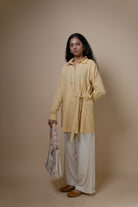 Our staple Angrakha shirt features a long straight silhouette with a classic shirt collar and placket extending into a belt that cinches the waist for a flattering fit. Delicate Mulmul piping along the collar, placket, and cuffs, adds detail. Belt loops at the back add an extra cinch, enhancing the overall shape.