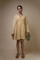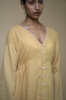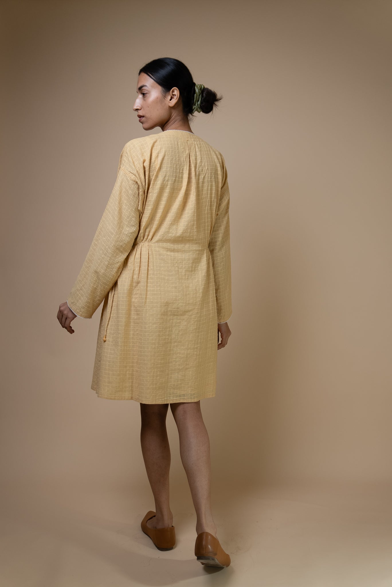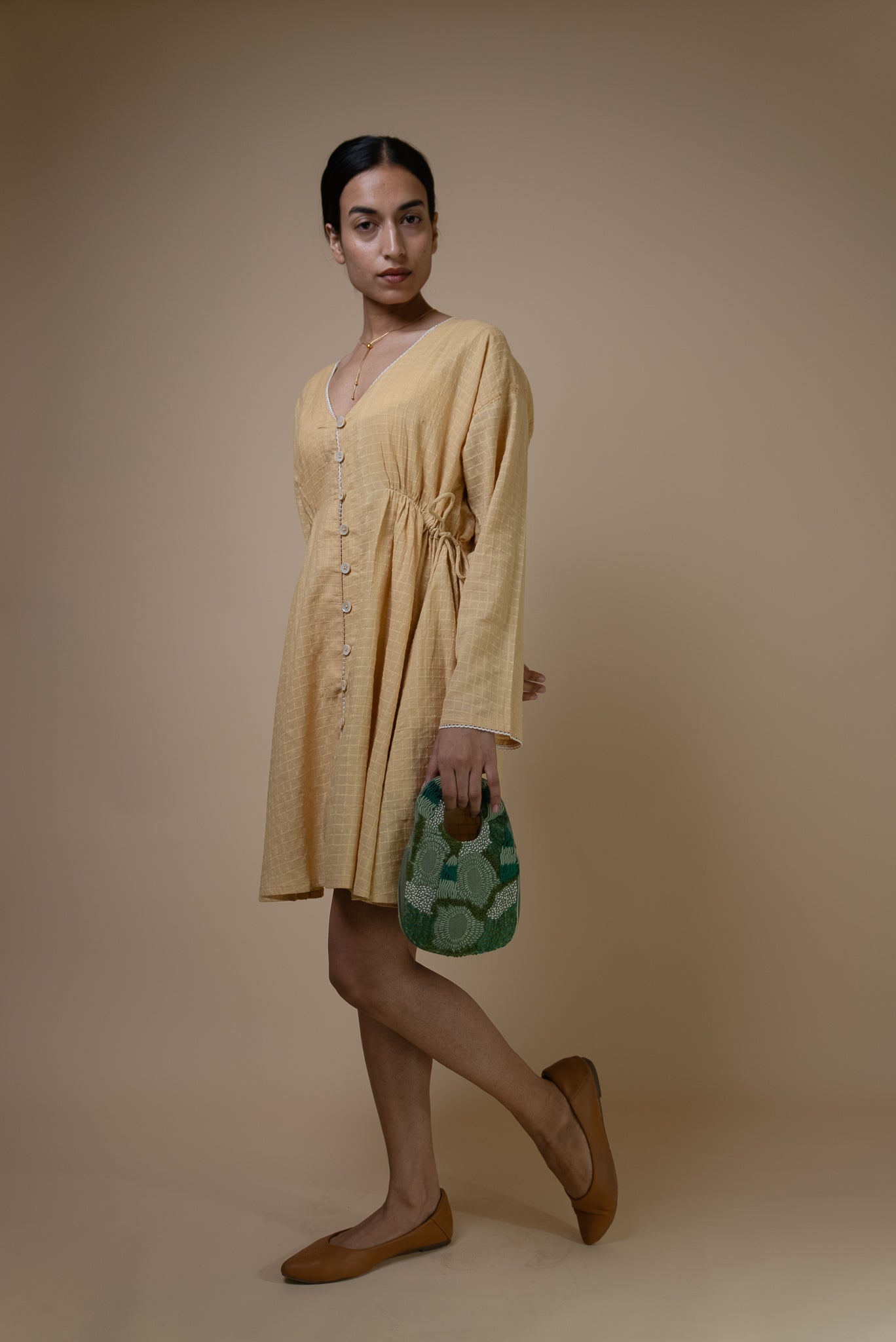 Crafted from 100% cotton fibers and natural materials, the Meadows Cinched Dress is naturally dyed using Myrobalan and Madder.
