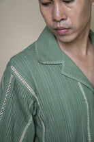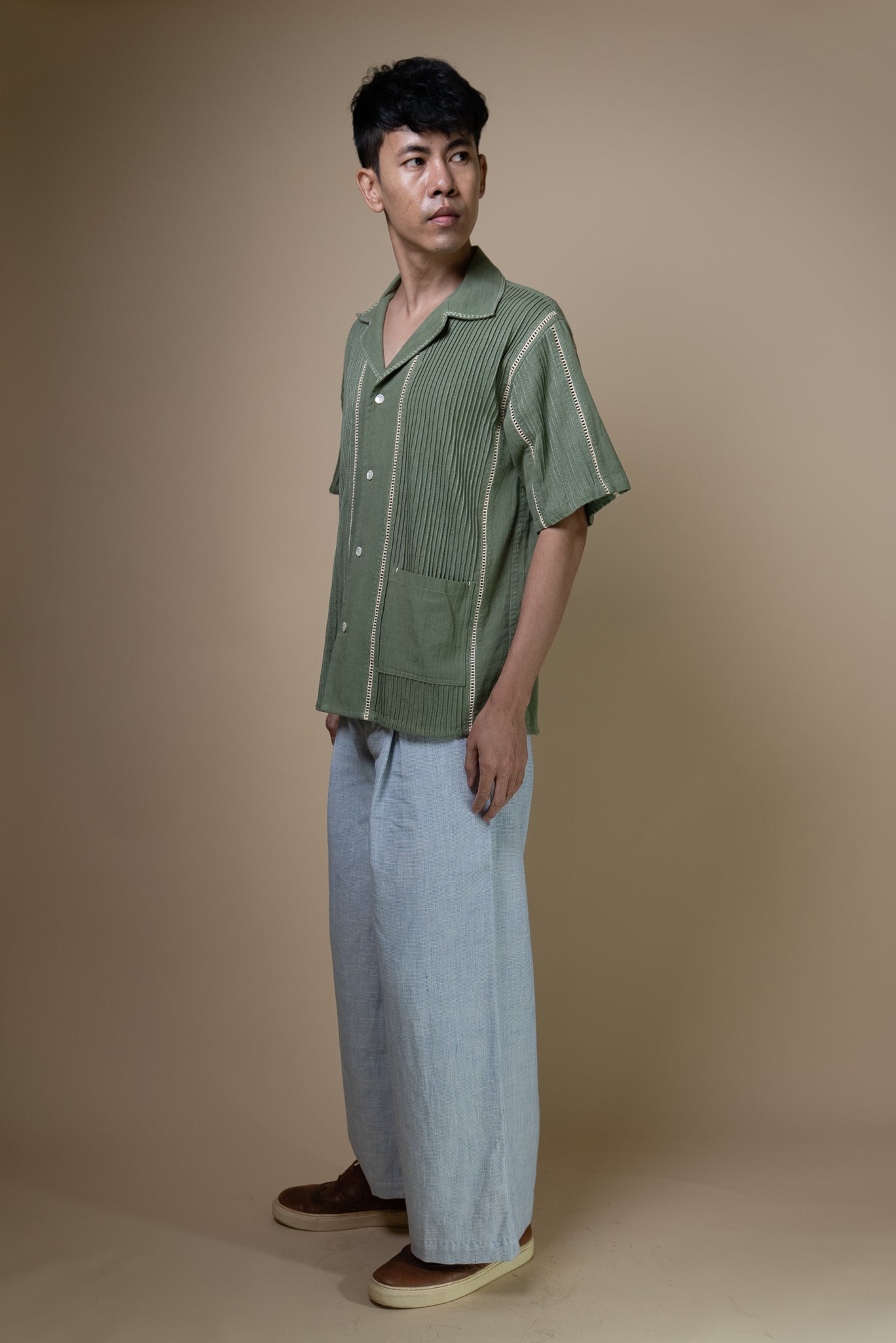 Designed in a relaxed-fit silhouette, it features a cuban collar lined with Kantha detailing. To enhance the shirt’s simplicity, pintucked panels are placed on the front, back, and sleeves, while ladder lace inlays provide an elevated touch. A single patch pocket on the front, accented with notch details, completes the design.