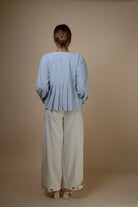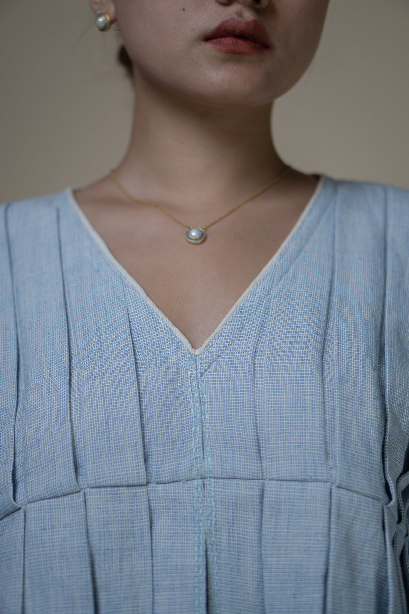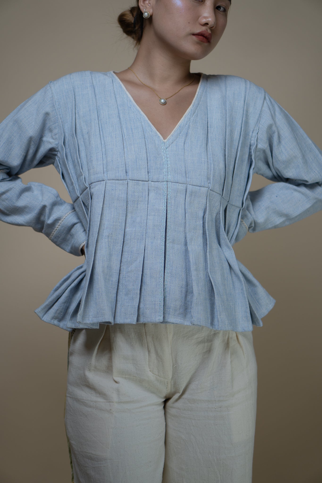 Crafted from 100% cotton fibers and natural materials, the Meadows Pleated Blouse combines azo-free dyed handwoven blue cotton with a hint undyed Kala Cotton.