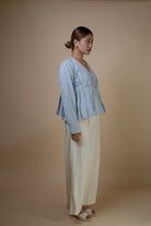 This piece embodies the appeal of simplicity, allowing the natural texture of cotton to take center stage. Meticulously crafted, the V-neck blouse is framed with subtle piping and features box pleats that flow gracefully. Lace detailing on the sleeves, paired with minimal Kantha embroidery, adds a handcrafted touch, making this blouse a versatile staple for any wardrobe.