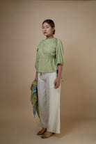 Crafted from 100% cotton fibers and natural materials, the Meadows Ruched Blouse is made from handwoven sage green cotton, naturally dyed with indigo and pomegranate. The subtle slubbed texture of the fabric adds a unique character to the piece.