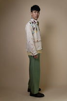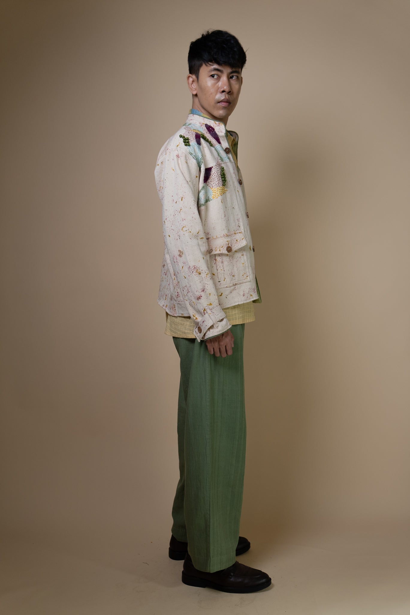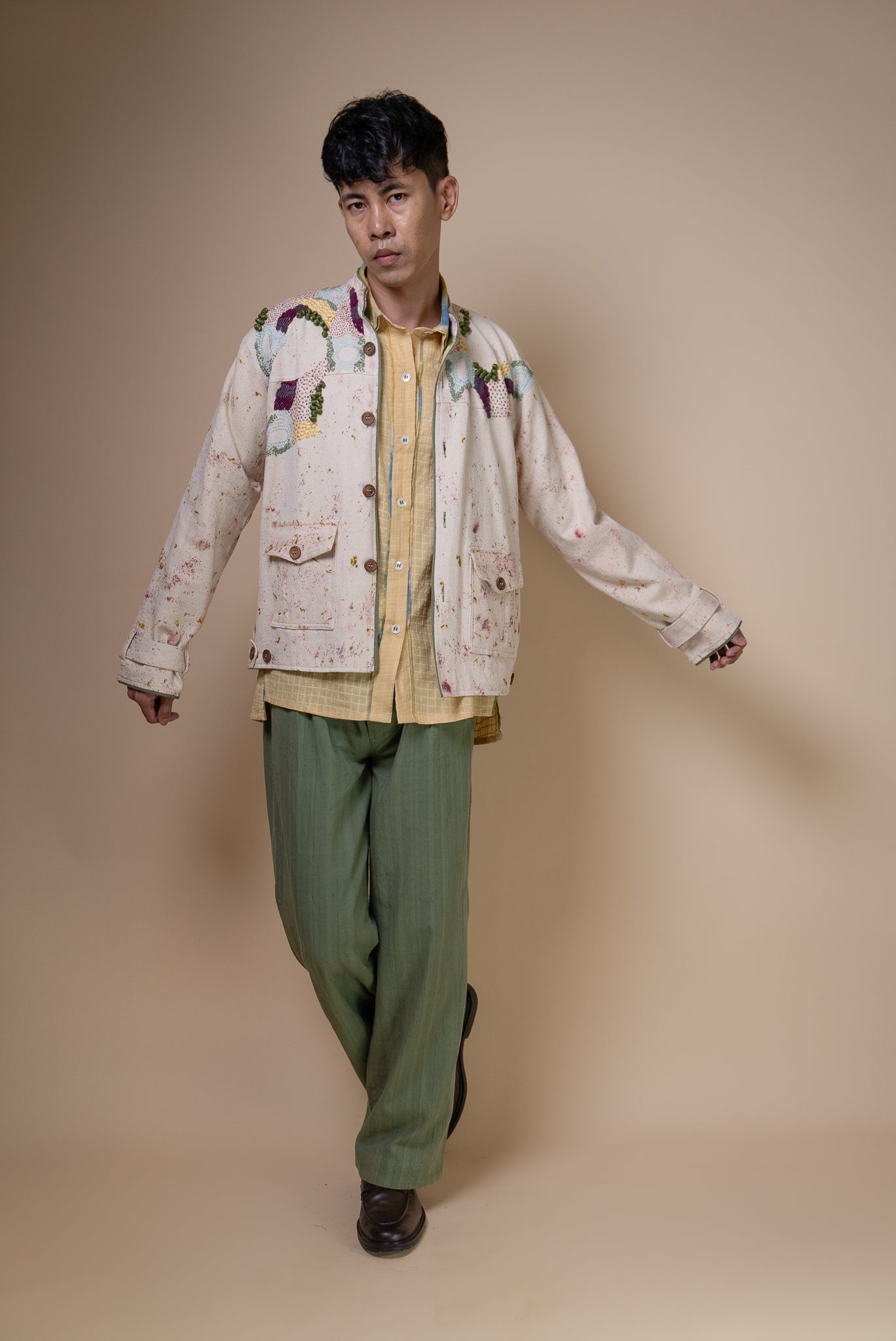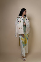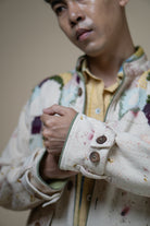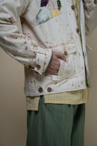 The intricate hand embroidery showcases a mix of techniques— embellishments with wooden beads, delicate French knots, bullion knots, lazy daisy, and traditional kantha stitches. Flowing organically from the shoulder, the embroidery mimics the natural spread of moss, giving each jacket a unique, handcrafted finish.