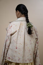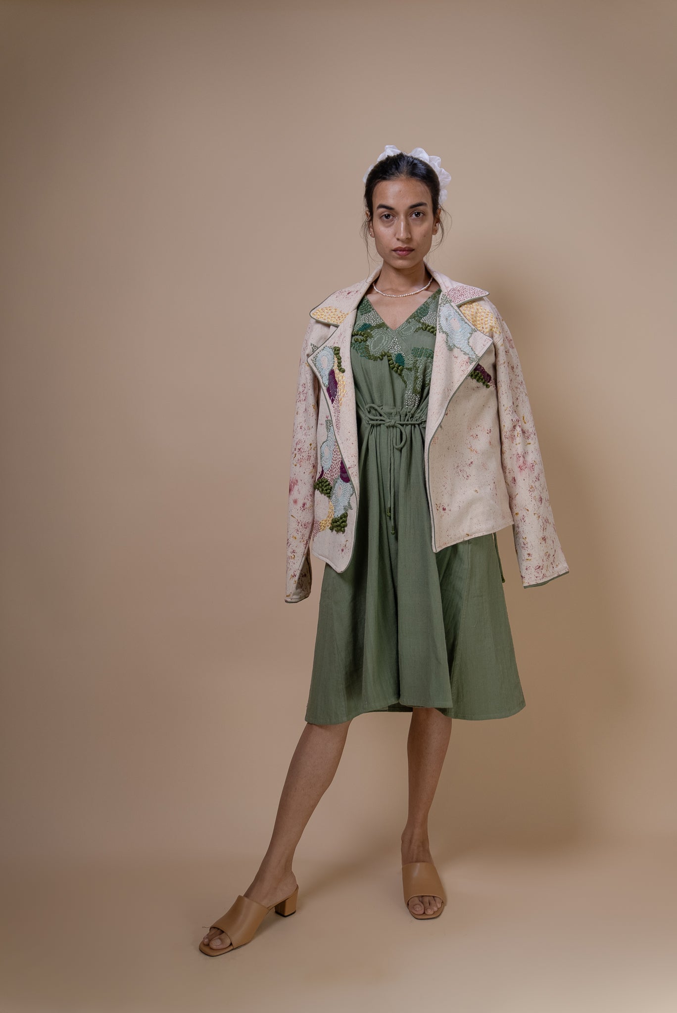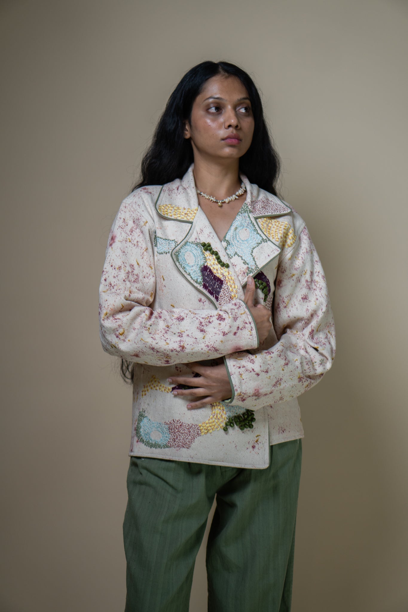 The intricate hand embroidery blends techniques like French knots, bullion knots, lazy daisy stitches, and traditional Kantha work, with wooden beads serving as 3D embellishments. Flowing organically from the front and spreading across one side, the embroidery mimics the natural flow of moss, making each jacket a unique, handcrafted piece.
